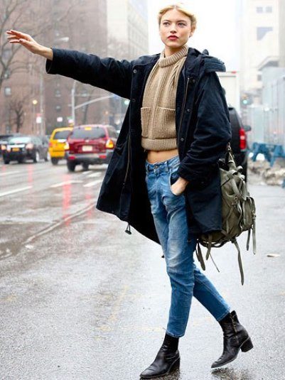 Another option with a park, this time in blue, but with half boots on a short square heel. The height of the shoe allows you to wear blue cropped jeans. On top of a cropped sweater beige. As a bag used khaki backpack.