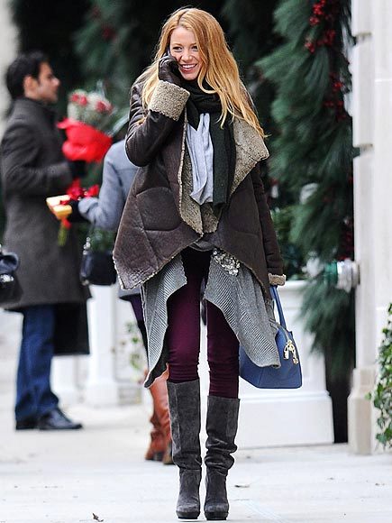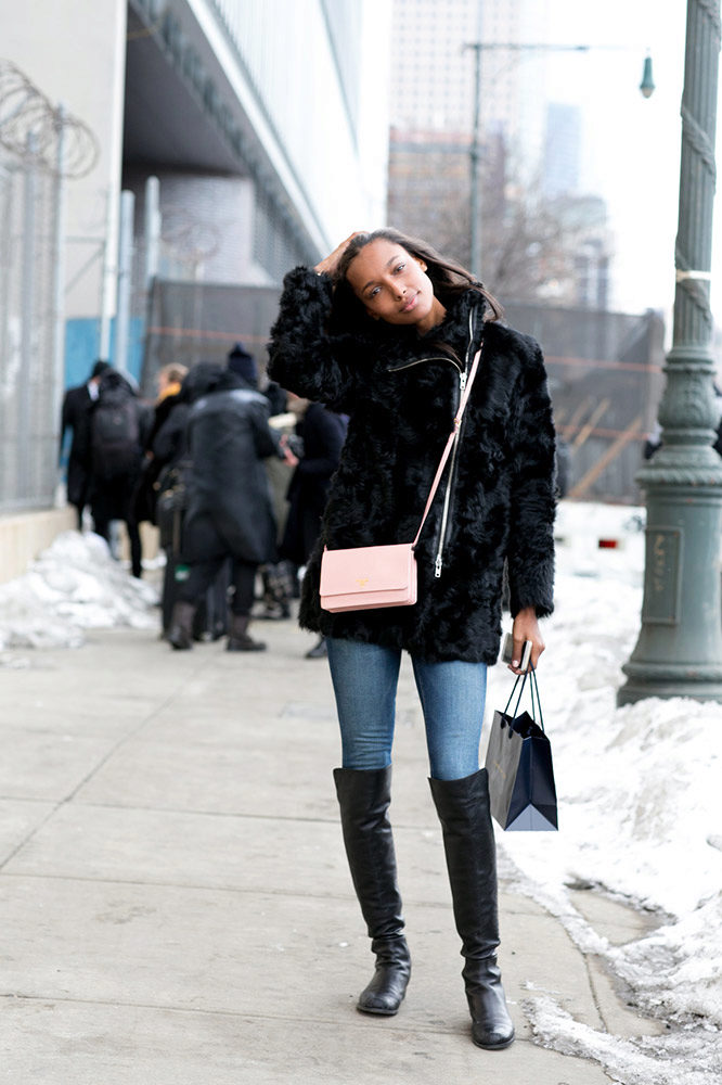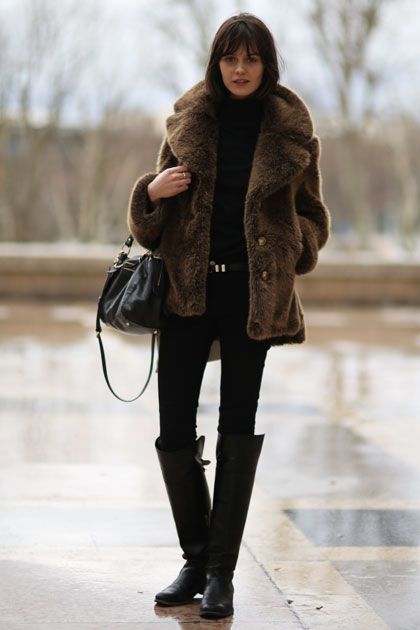 Boots with a thick stable heel (black top and brown heel) are combined with a short parka with fur.Dark jeans are tucked under the boots, and a large black rectangular shoulder bag fits black leather gloves.