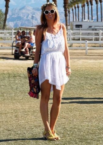 Mini-sundresses allow a woman to successfully combine style and convenience, while demonstrating slender legs. You can choose a short model that hides other problem areas - the tummy or small breasts. For example, a short sundress tunic that gently drapes a piece from above, and its length can be as extreme as you want.