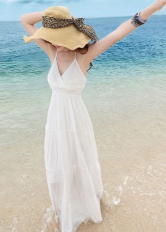 Sundresses are also loyal to such summer accessory as a hat. A light chiffon dress will be incomparable with a straw hat, and a cotton or linen option, especially with a striped print, with a hat, styled as a captain of a sea captain.