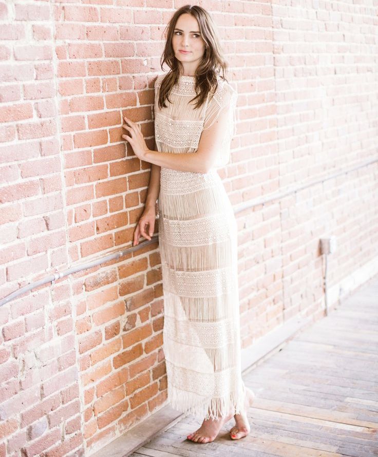 A white-and-white dress on the floor, with an openwork top and a flying skirt will be an ideal option for a date or an evening out. Thin bracelets and a sand-colored clutch bag make the image warm, but at the same time rich and solemn.