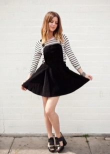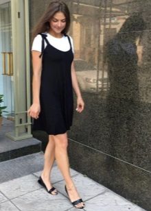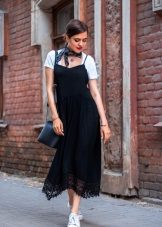 Denim sundresses look good with T-shirts, both monophonic and bright patterns.
