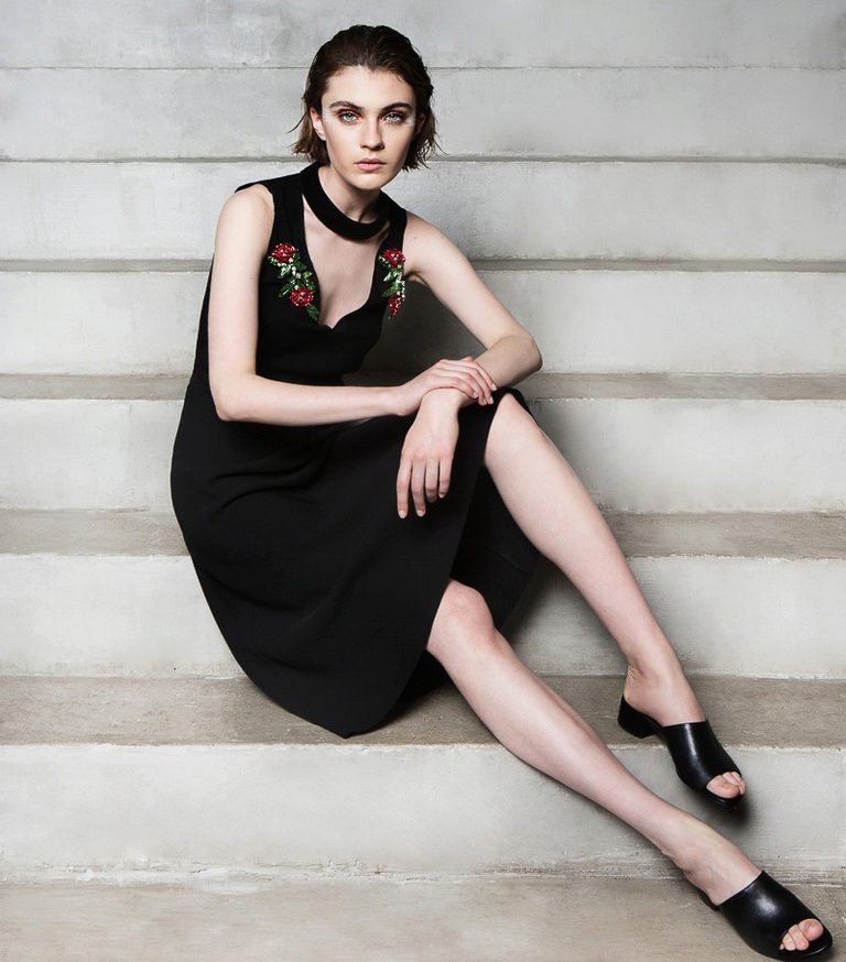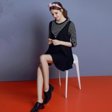 Knit straight dress on thin straps refers to the casual style. As a decor, a leather belt with a gold buckle, which focused on a thin waist. Color and style only enhanced the natural beauty of its owner.