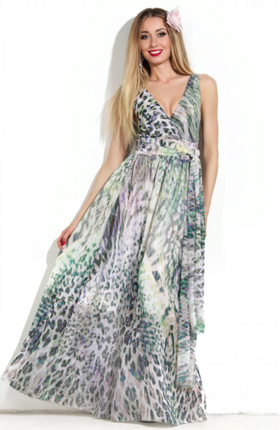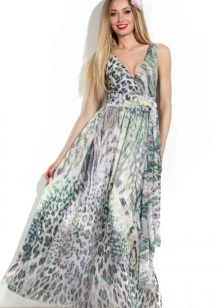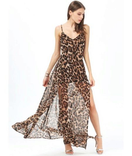 Bright and sexy looks sundress on the floor, decorated with leopard print. Two cuts from the thigh show the beauty of slender legs. The model is presented on the straps and beautifully highlights the neckline. The perfect complement is exquisite silver sandals on heels.
