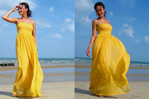 For relaxing on the beach, a long sundress of bright yellow strapless color is perfect, so that the tan lies beautifully on the shoulders. Model with a high waist is suitable even for girls with overweight. This sundress swells wonderfully with the wind and falls down beautifully.