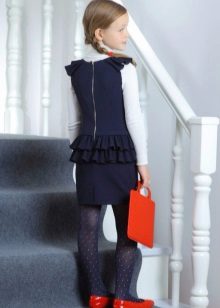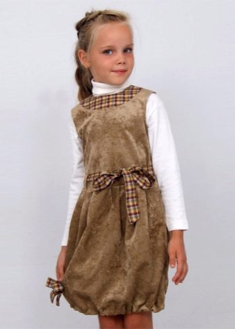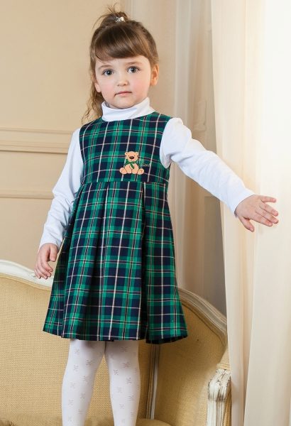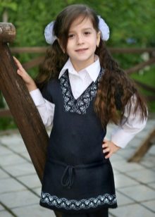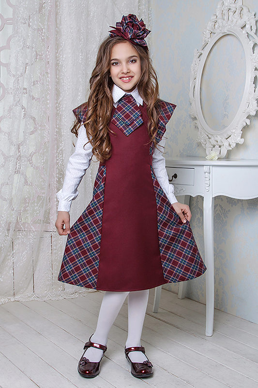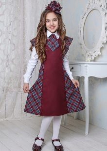 Stylish and discreet option that is perfect for school. Classic patterns make the appearance of the girl strict and neat, and flounces on the sleeves allow you to transform the image into a solemn one. In combination with a white blouse in the French style sundress looks elegant, but at the same time businesslike.