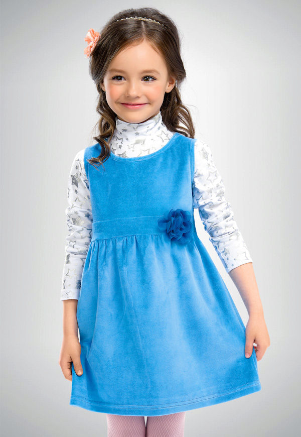 Velor sundress with a beautiful flower - A good option for every day. Thanks to the pleasant and comfortable material, the child will not freeze even in a cool room, and the universal pale blue color is at the same time practical, but gentle. This model is successfully combined with a blouse, shades of which have something in common with print.