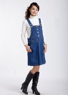 Another successful combination of a denim sundress with a turtleneck. The whole image is made in blue, but the shades of each component are completely different, which makes it interesting and not boring.This sundress was clearly chosen not in the store for pregnant women, but look at how well he sits on a figure with a rounded belly. Again we see a high waist, loose fit and smooth lines.