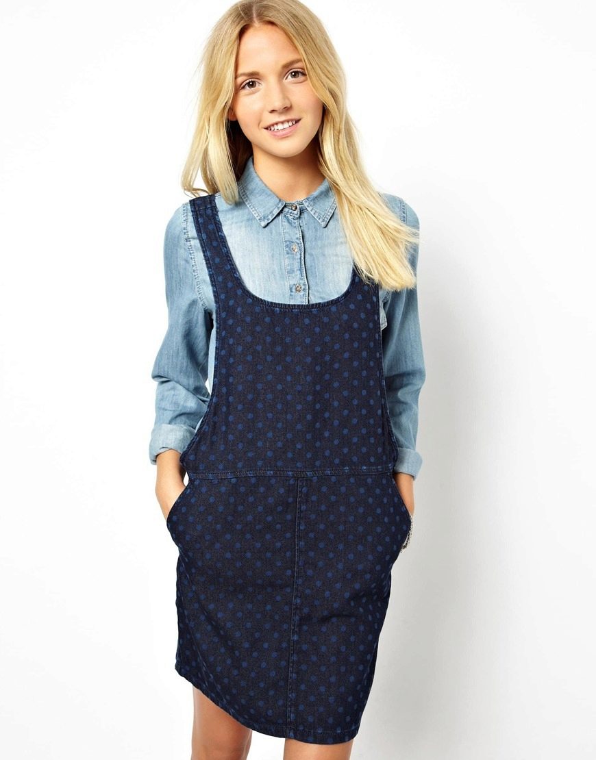 For a cooler weather and in the offseason, along with a denim sundress, you can wear a jacket of the same material, but in a different shade. As a shoe, you can consider shoes or sneakers, which will look unusual with golf, leggings or bright tights.