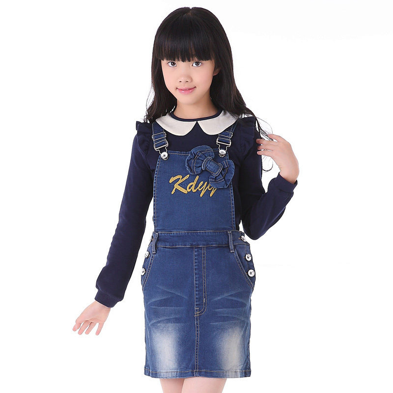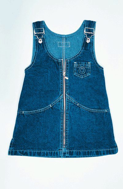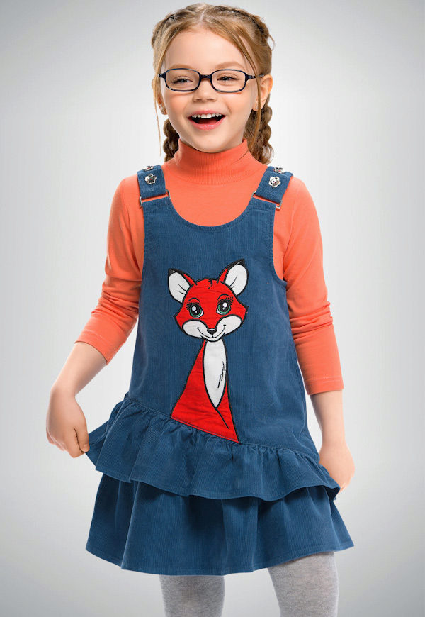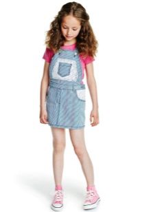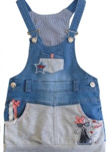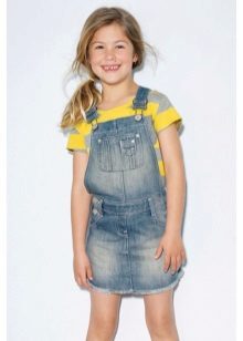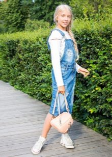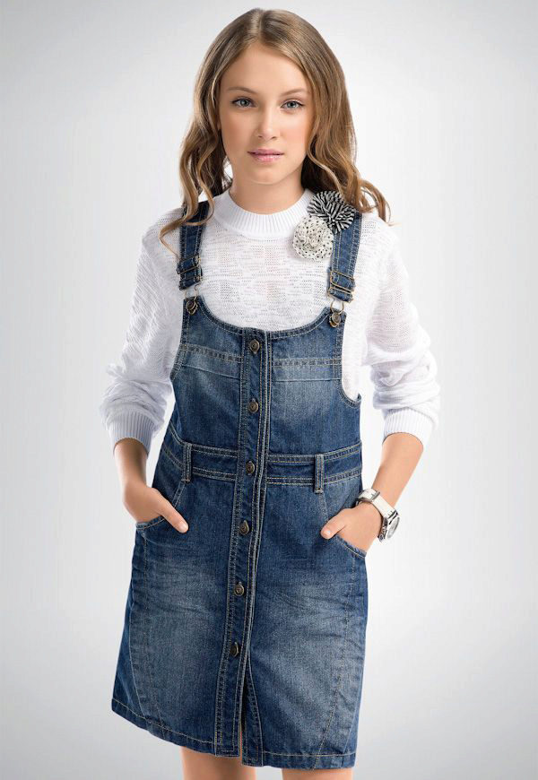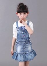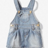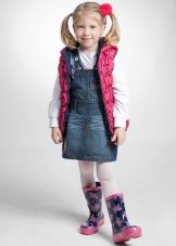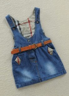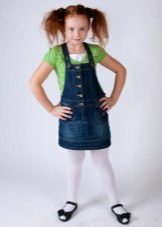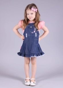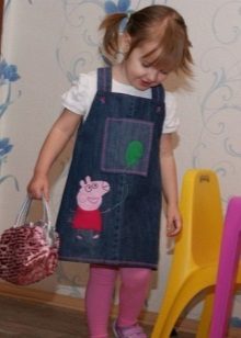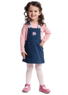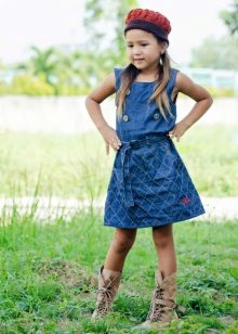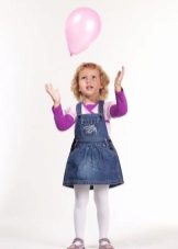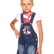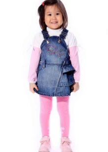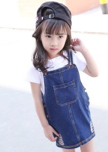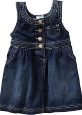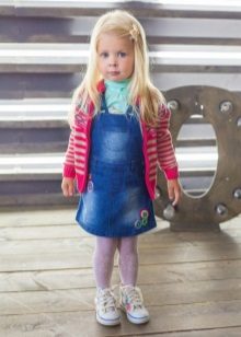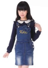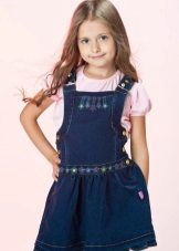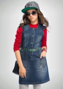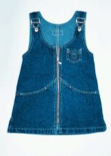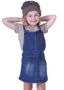 - Warm denim sundress for the autumn-winter period is best to choose from a thick, thick denim. Some models are additionally warmed with a special lining. Such a dress should have a sufficiently free, simple cut so that the turtleneck worn under it does not hinder movement and does not interfere with the child.