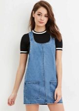 Solid denim sundress with a minimum of decorative elements looks great with a bright shirt, printed turtleneck, luxuriously decorated blouse.