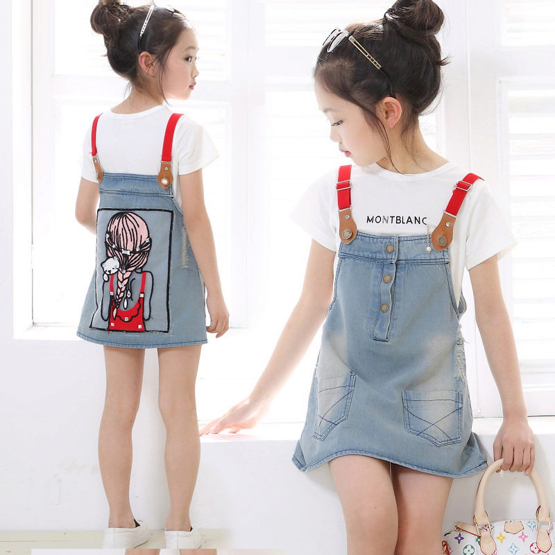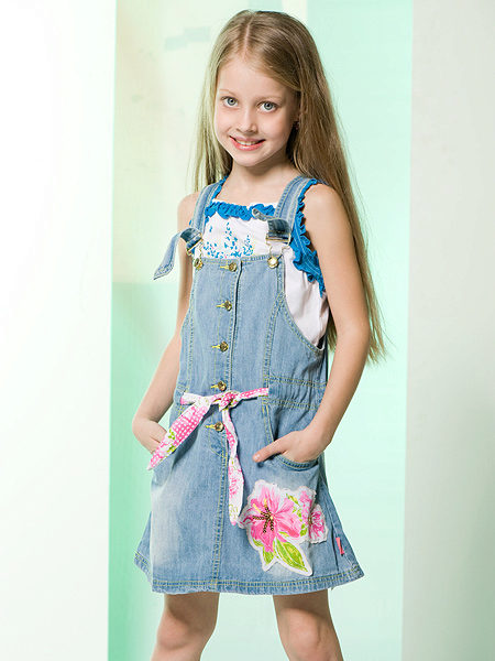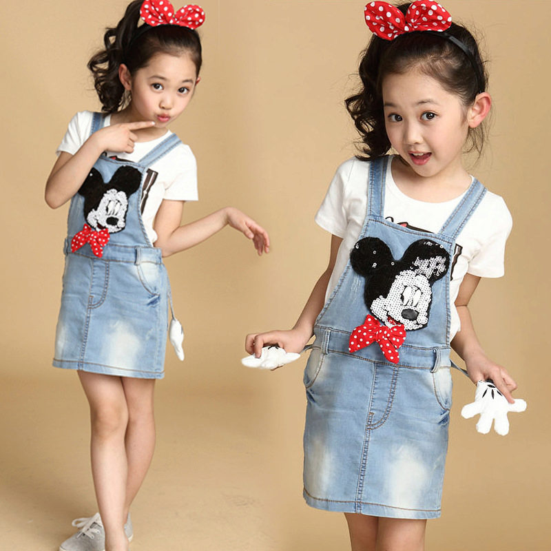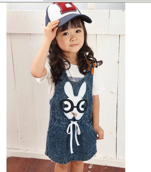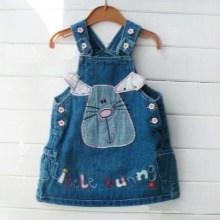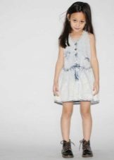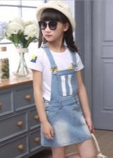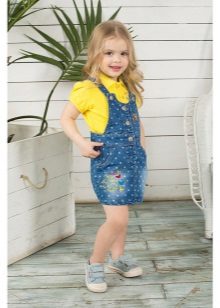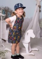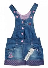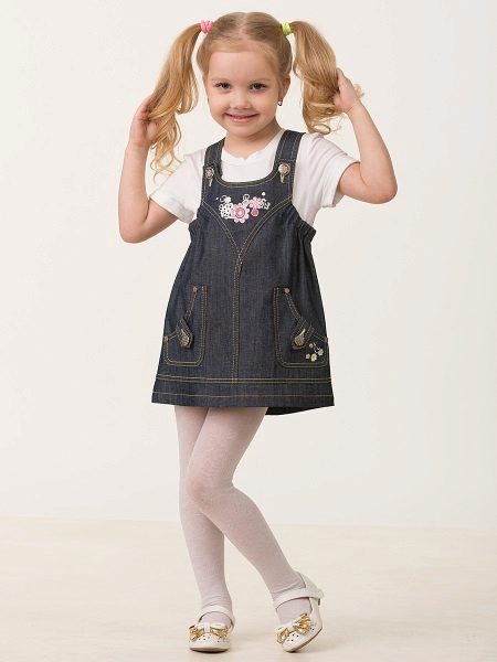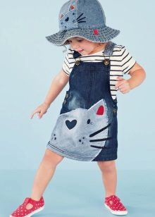 For a little princess, there is nothing better than a denim sundress with a straight silhouette on an elastic band. Such a model and looks very stylish, and put on her very no difficulty. And what kind of child does not like applications in the form of funny little animals? White T-shirt, denim cap and a young beauty is ready to go!