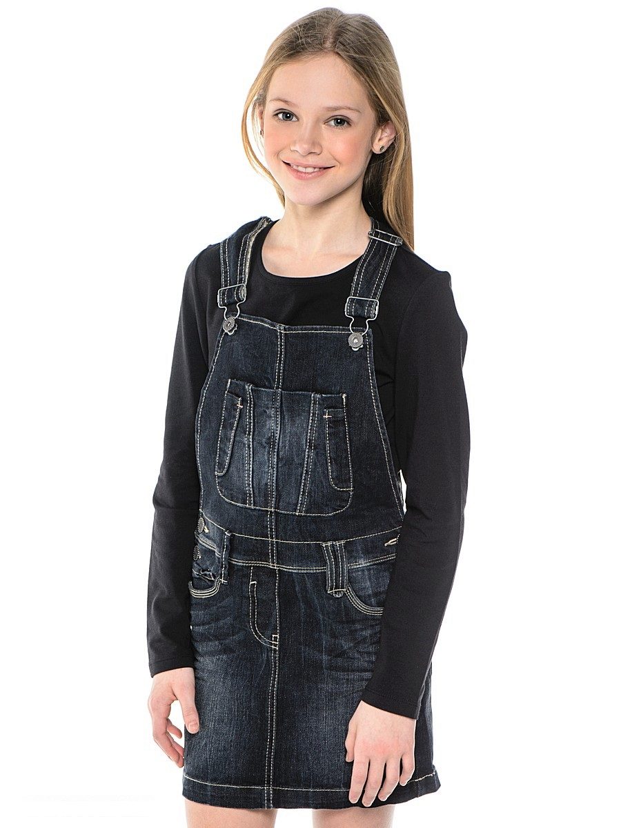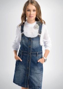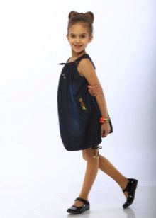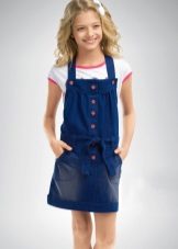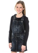 - School dress. If the dress code of the school allows a free style of clothing, the denim sundress will become just an indispensable element of the school wardrobe. A black, dark gray, blue or blue dress straight, fitted, trapezoid silhouette or flared is perfect for school blouses, shirts and turtlenecks. The girl looks very neat and elegant.