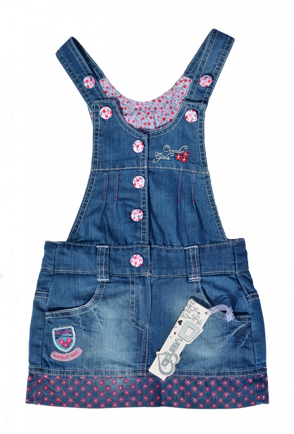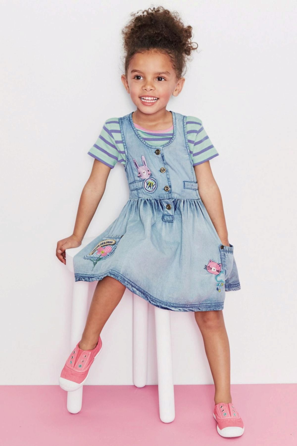Denim sundress - not only practical and comfortable thing. It can easily become the basis for a festive attire. The soft blue silhouette trapeze sundress is decorated with delicate embroidery, satin ribbons and tiny pink buttons.In this outfit, you can go on a birthday party to friends, on a matinee in a kindergarten or on another festive event.