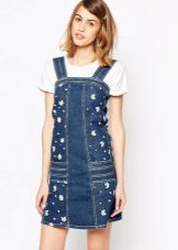Despite the fact that jeans itself is a rather interesting fabric, designers annually compete in its decoration. Denim sundresses are often decorated with embroidery - it can be on the back or chest, go on the sleeve or hem, create an asymmetric pattern.