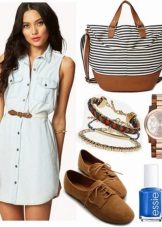 Sundresses of direct cut will be good with shoes with decor in the form of straps and weaves, with fringe. With a fringe can be a bag or a backpack, then the image will be in the style of "country". From jewelry it is worth looking at the bracelets - many thin ringlets on the wrist, leather laces or large beads would be appropriate.