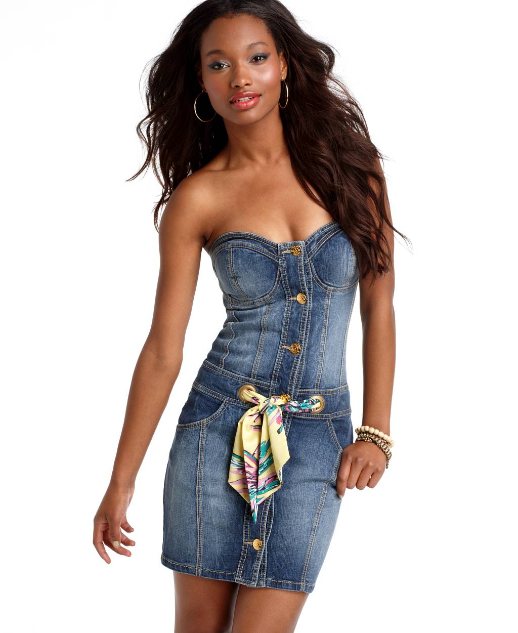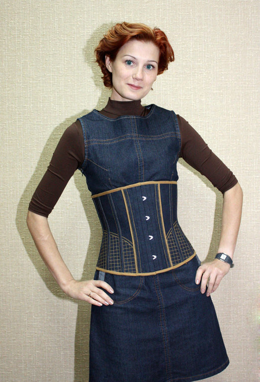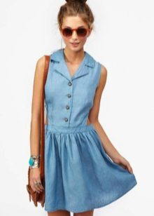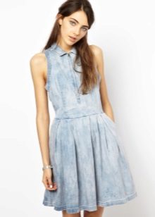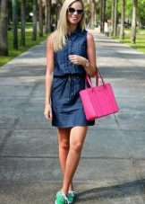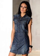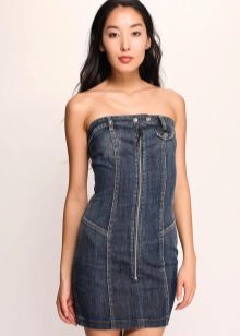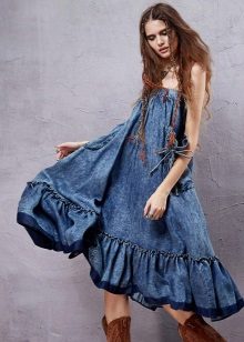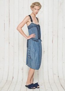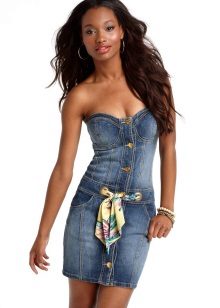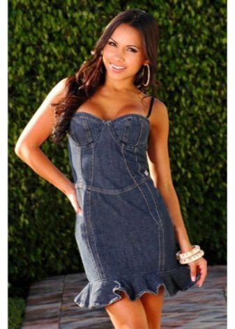 A sundress case made of jeans without sleeves and straps beautifully emphasizes the bust, and the O-shaped silhouette of the skirt makes the hips seductively rounded. This simple and convenient option goes well with a leather belt and massive jewelry.