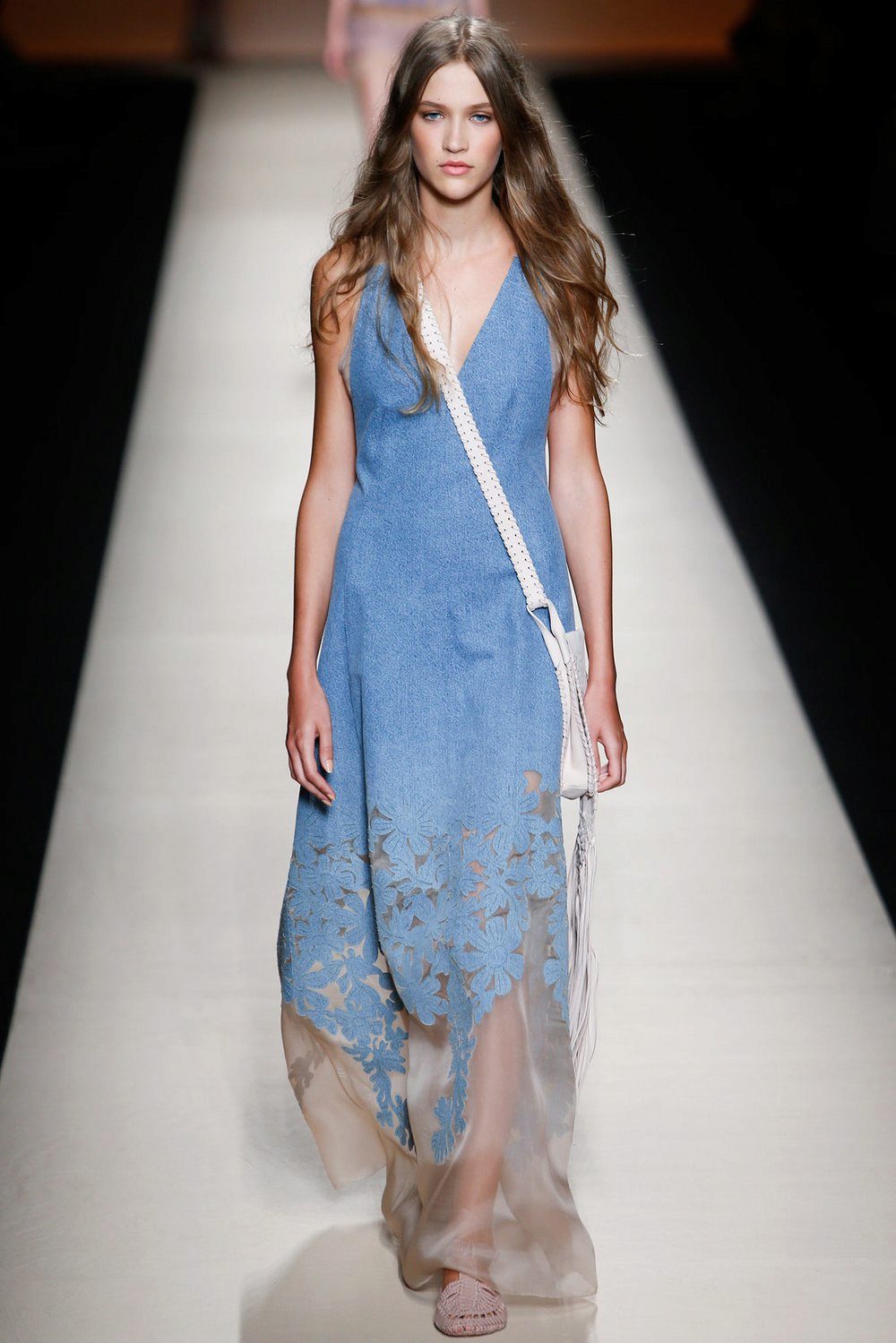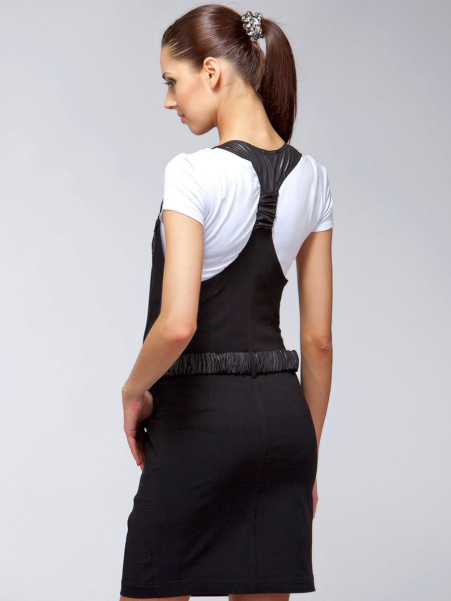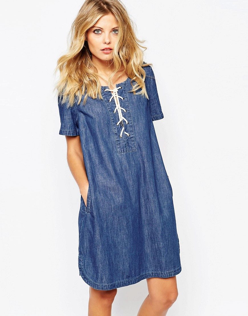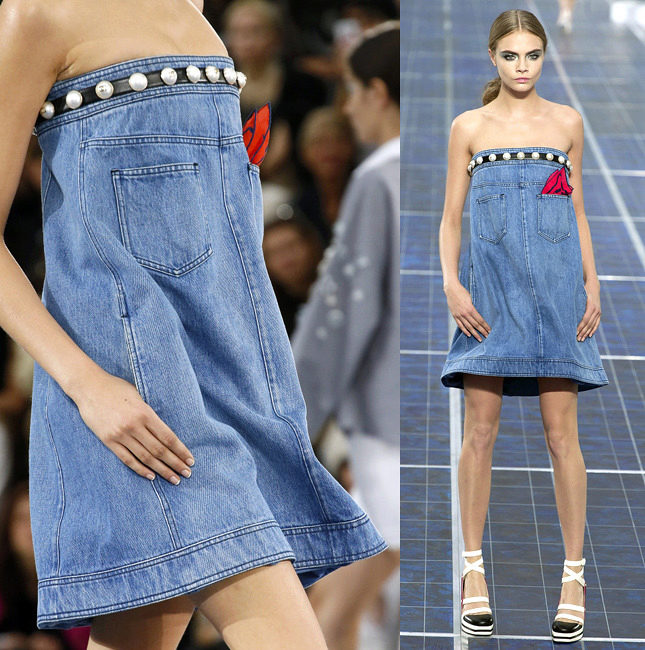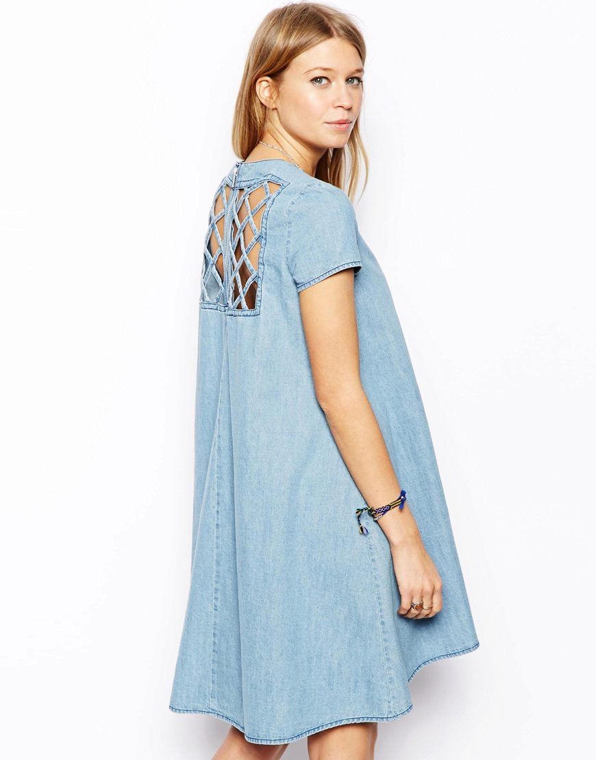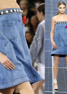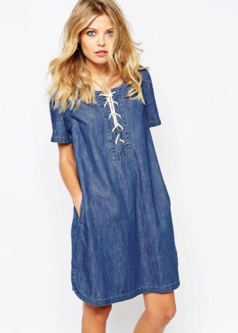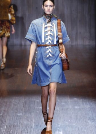 Another option for a denim sundress is leather lacing. Designers use it to create eye-catching cuts, both on the skirt and in the neckline. Such models can be supplemented with belts or leather overlays on pockets or collar.