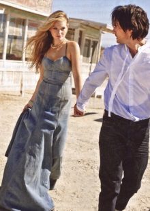 The advantages of denim sundresses, first of all, made out modern celebrities - from their wardrobe, this thing does not almost never come out. Denim sundresses with enviable consistency and decorate the red carpet, and city streets.