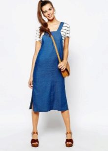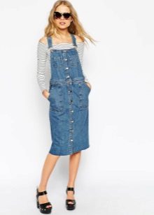 No less relevant are sundresses made of denim with a midi skirt. So that the insidious length does not cut the figure in half and does not shorten the legs, stylists advise to choose models with an overestimated waistline. Then the skirt visually "stretches" the legs, stabilizes the proportions. The result will be a flawless silhouette.