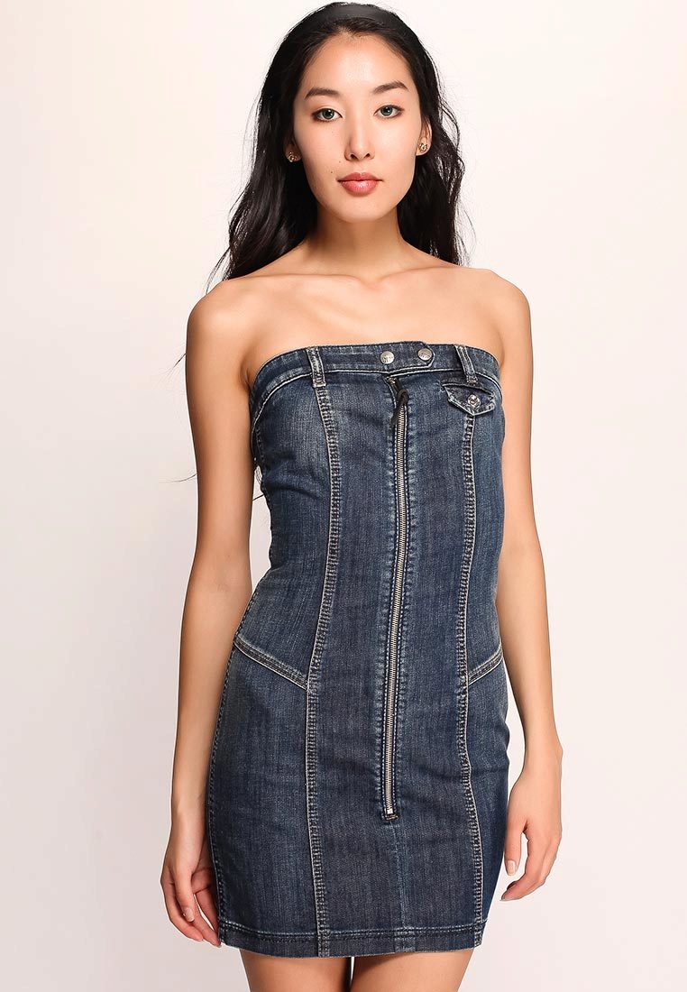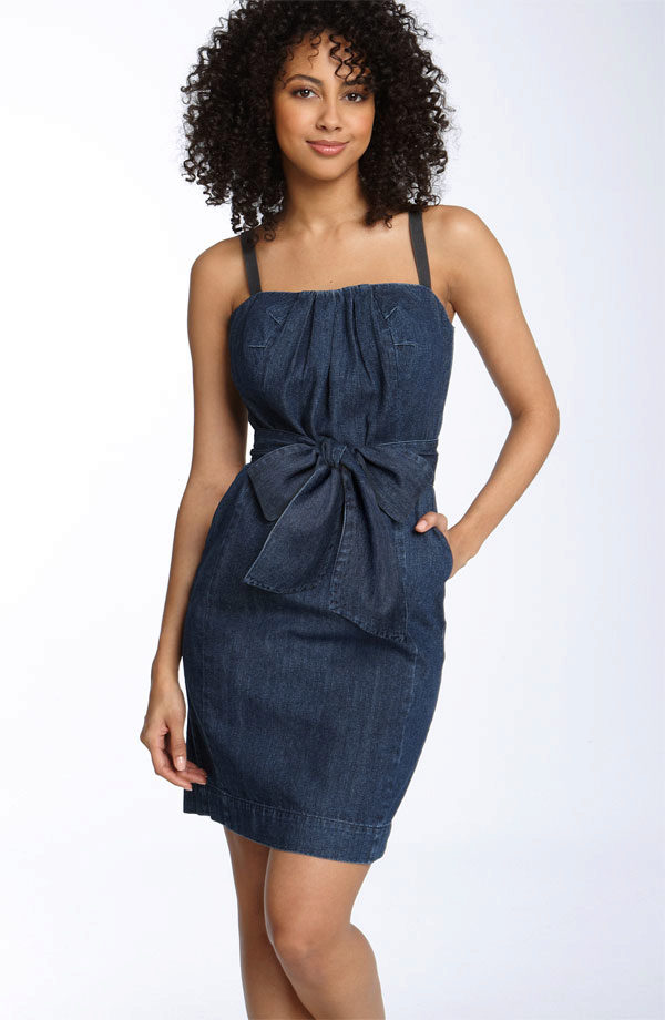 The original dark denim dress with a bow-shaped decor creates a romantic but modest look. The dress has a cut "tulip", comfortable straps and a beautiful cut. This stylish option is good on the naked body, it is self-sufficient so that it does not even require accessories.