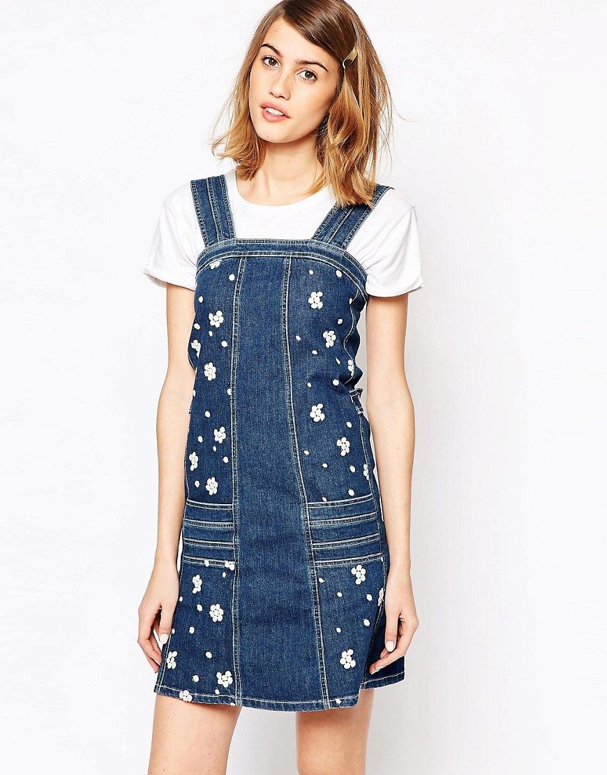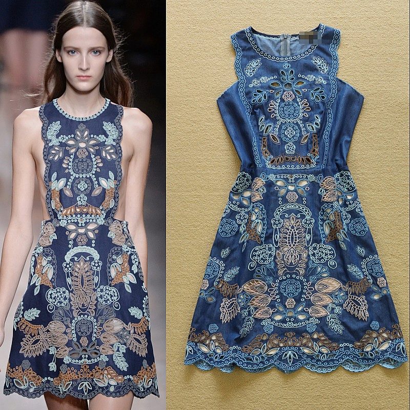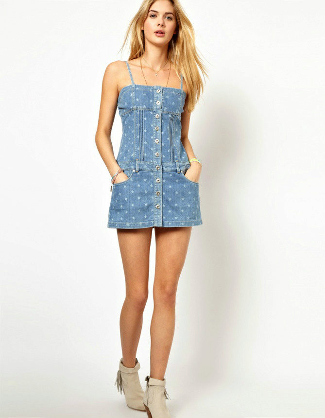 Another favorite designer denim decor is metal. Metal rivets, zippers or even spikes are the perfect complement to this material. Denim sundress perfectly holds its shape and the metal decorations will not be lost and will “leave” the product, so girls with sundresses like girls who want to make an image a little more brutal.