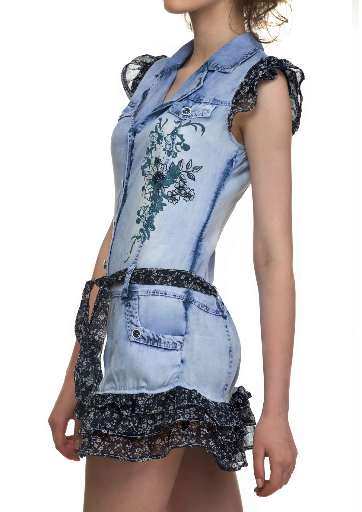 Denim sundress stylish cut, which adorns the feminine bright print. The wavy ribbon that crosses the sundress from shoulder to hem makes the model elegant and flirty, and a bright belt in tone with the pattern adds a zest.