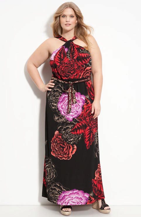 That is exactly the floral print that we praised so much. Large drawings, arranged in a chaotic manner, do not make the figure even fuller, but on the contrary, distract attention from shortcomings, smooth out lines and slim. Wide straps are made in the same style with a wide belt that emphasizes the chest and blends the waistline. Easy image, good style - in this way you can even go to the office, if you add, for example, a short white jacket.