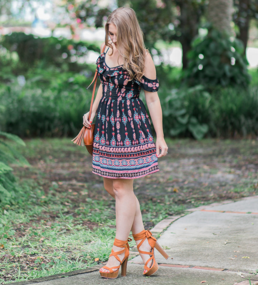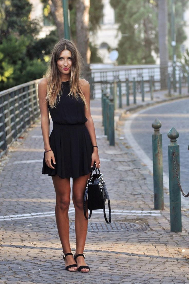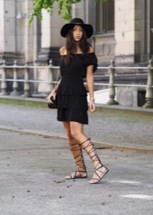 - If you prefer high-heeled shoes, choose a thick and steady heel. Fashionable sundress with a lowered shoulder will be a bright basis for the image. A brown handbag with a long strap and sandals to match the bag will complement this stylish and sophisticated look.