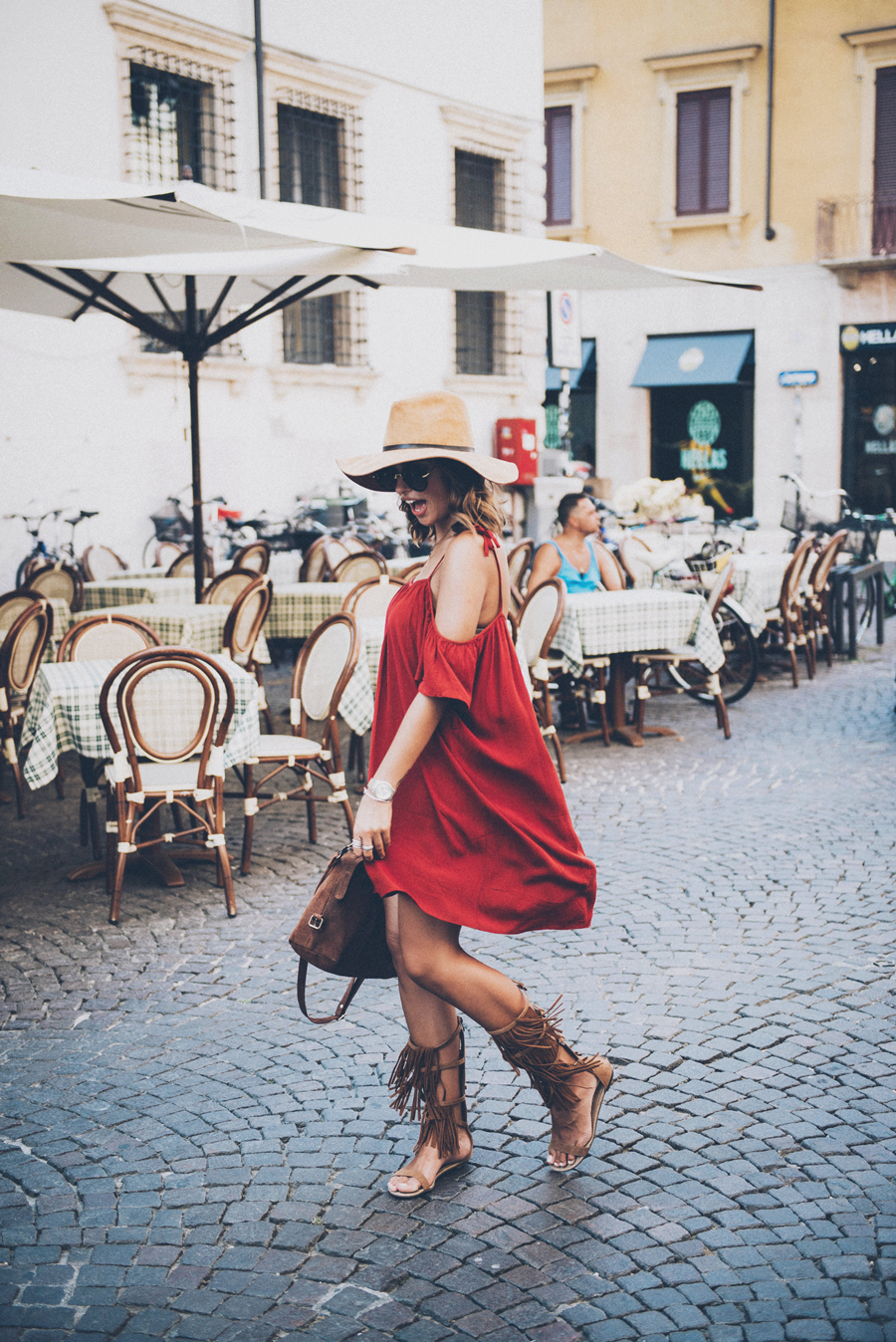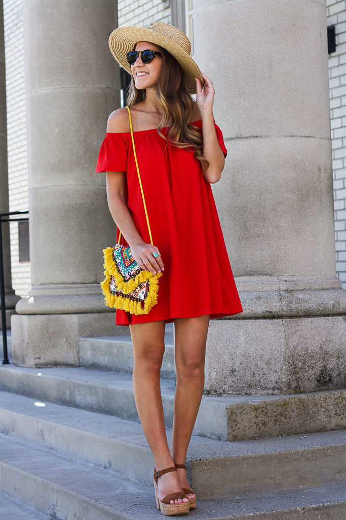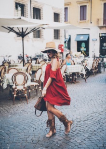 - A bright red sundress with a lowered shoulders won't exactly leave you unnoticed! Babydoll style will give the image a certain amount of naivety and coquetry. Straw cap protects from the scorching sun. Comfortable sandals on the platform are suitable for both day and evening out. A bright yellow handbag will be a real highlight of the image.