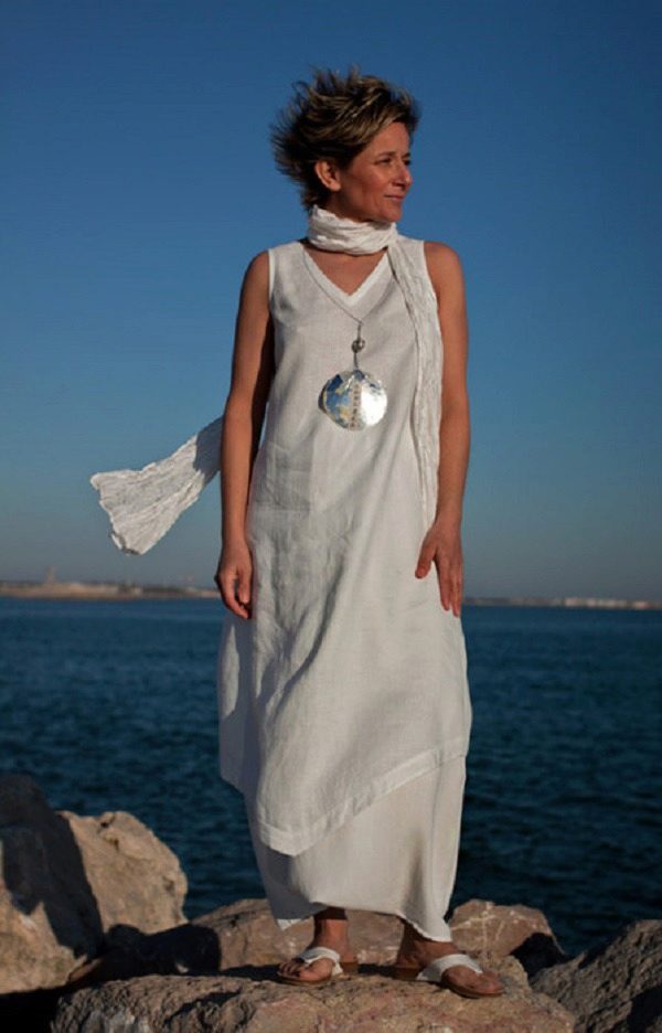 Flax goes well with their wood jewelry. You can wear long bright beads and wide bracelets.