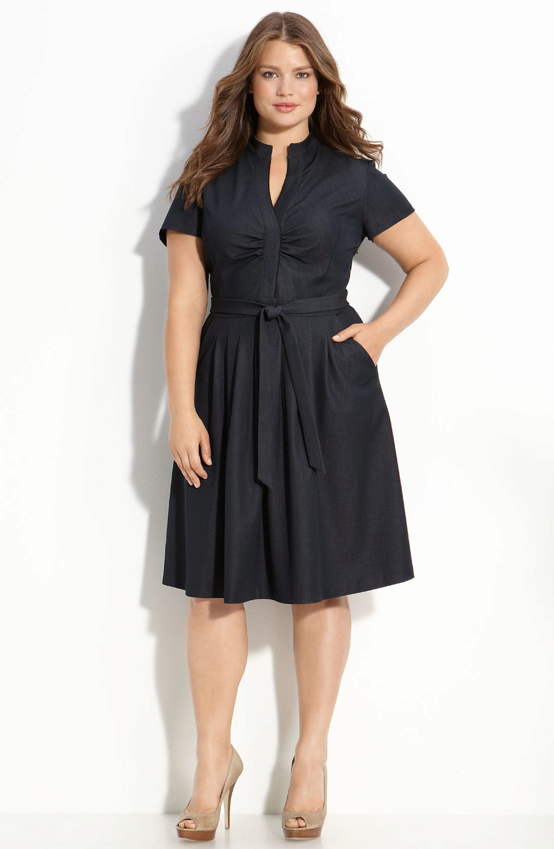 It is worth paying attention to the neckline of the dress. Best of all, a full-fledged girl will find a V-neck, which will visually lengthen the neck and show the neckline in all its glory.