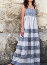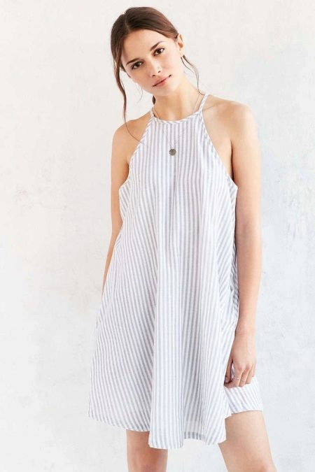 A very feminine and airy image from a flaxen sundress of a light shade in a gray strip will suit girls free and romantic. The vertical strip visually lengthens the growth, makes the figure slimmer and thinner. A round "washy" neckline of a sundress, which goes into thin straps on the back, gives fragility and elegance. The free A-silhouette of a sundress and the length above the knees contribute to enhancing the effect of the lightness and youth of the model. For such a side requires a minimum of accessories - a small pendant on a thin chain, a pair of thin rings on the fingers. The hairstyle will suit a smooth or bunched up.