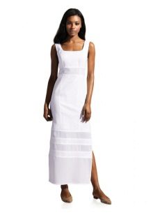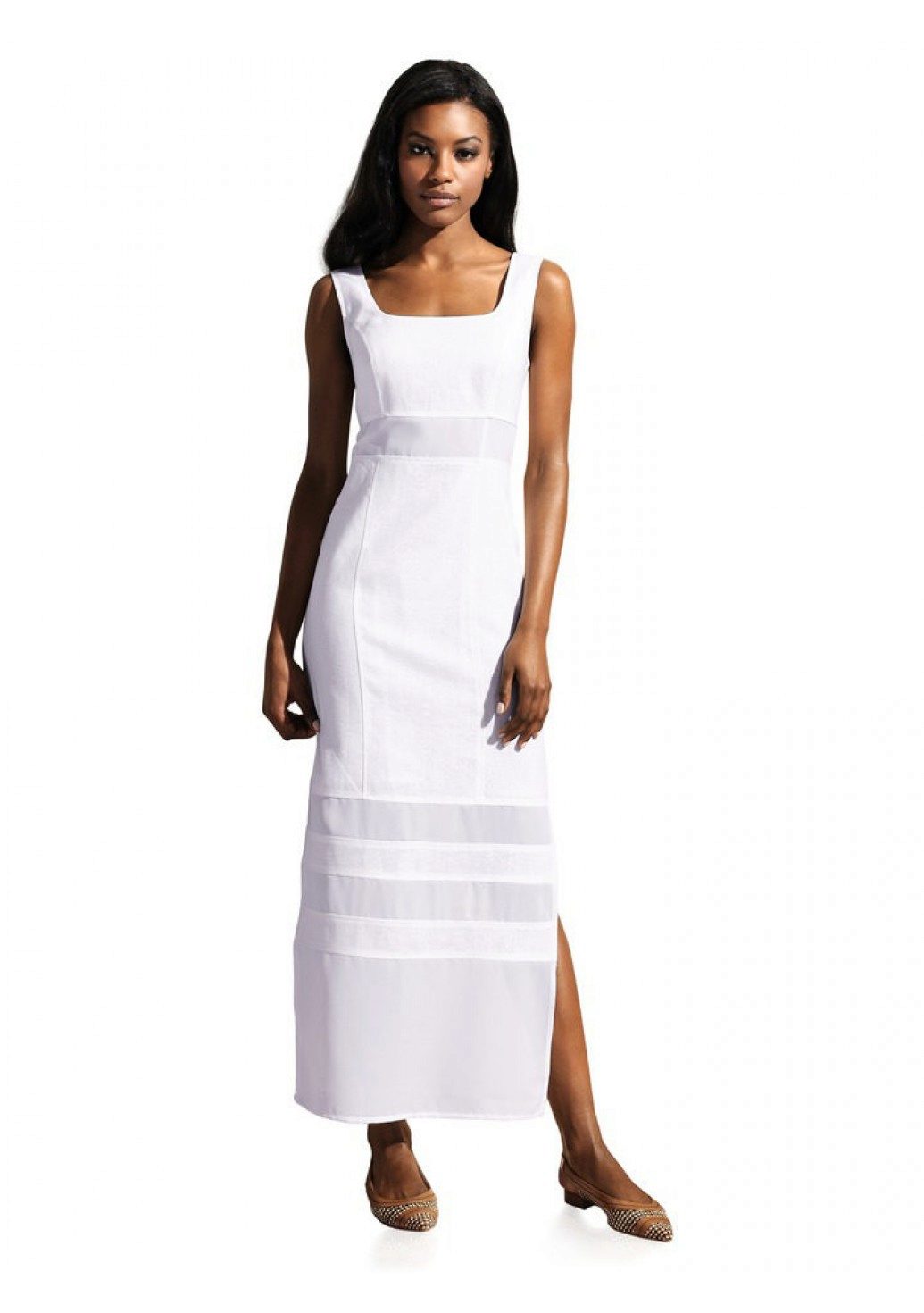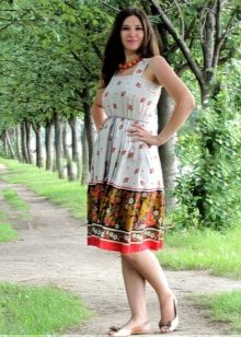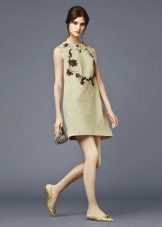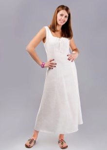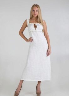 A straight white flax sundress above the knee length will look unusual and modern if it is decorated with embroidery of beads and sequins of bright color. V-neckline gives sensuality and visually lengthens the image. Wide straps sundress emphasize the line of shoulders and arms and add fragility to the image. In such a sundress it is appropriate to go to a party, a social event, complementing sandals with heels.