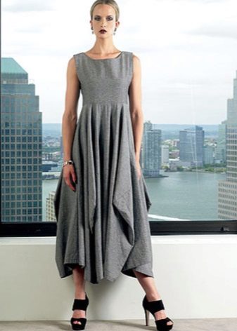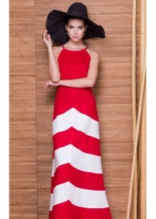 An interesting image will create a linen sundress in light gray and white striped. The effect of unusualness gives the dress a sundress at the waist and on the hem, where the strip changes its direction due to the rotated wedges. The hem of the hips extends downwards, which creates a slightly flying silhouette. The neckline of the “boat” gives slimness to the neck. Practicality adds pockets. This sundress is very go to the boats in color - gray, white. Of the accessories is to focus on thin wrists, decorating them with a voluminous bracelet of gray tint.