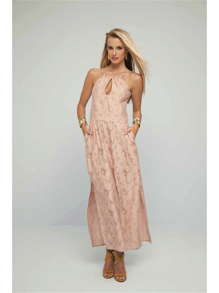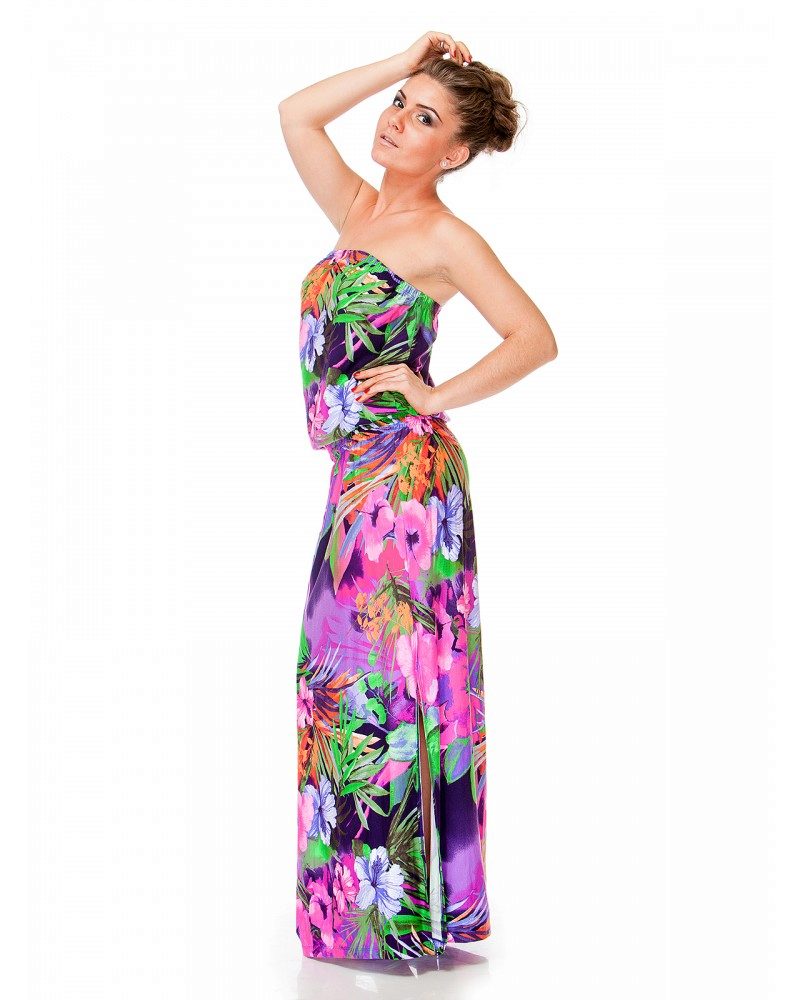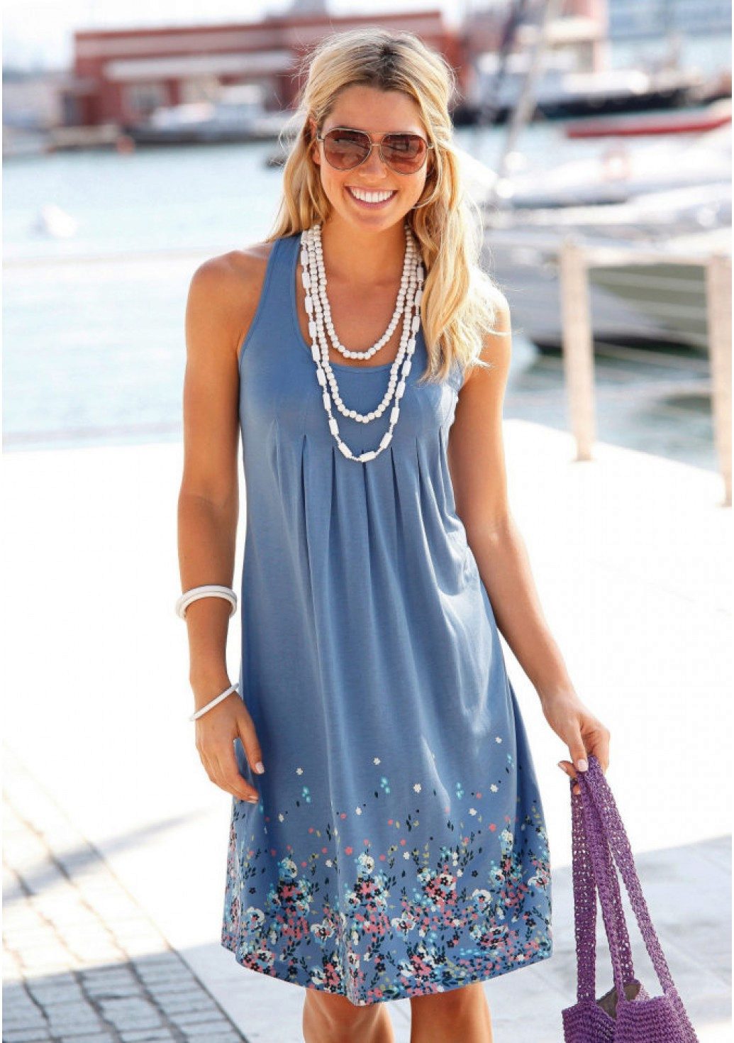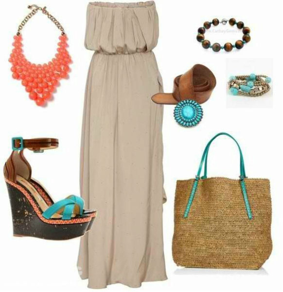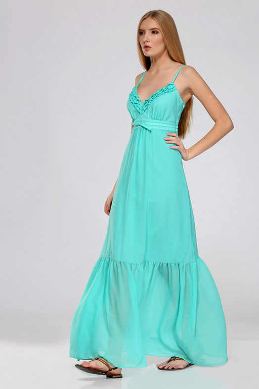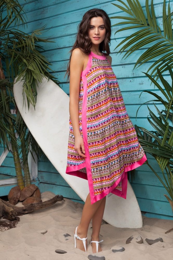 Excellent model from which just blows in the summer and holiday. A modest length is compensated by bright colors, and open shoulders and a decollete area balance closed legs. A large pendant and bracelets with shells and turquoise stones perfectly complement the outfit.