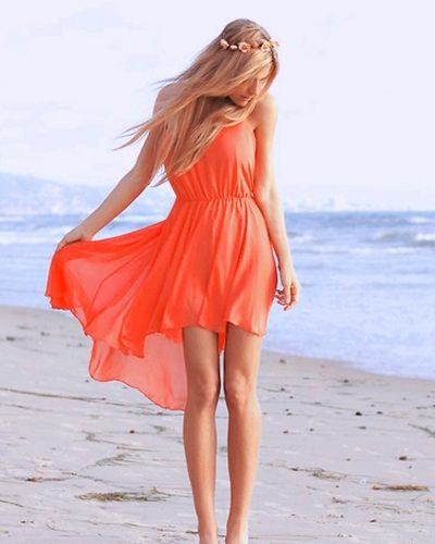 Playful, but at the same time, a simple orange-colored sundress - a great option for a day trip to the sea, and for a beach party. The asymmetrical cut of a flying skirt, tight-fitting top, a delicate wreath in the hairstyle and bare hands create a fragile, but not without sexuality, image.