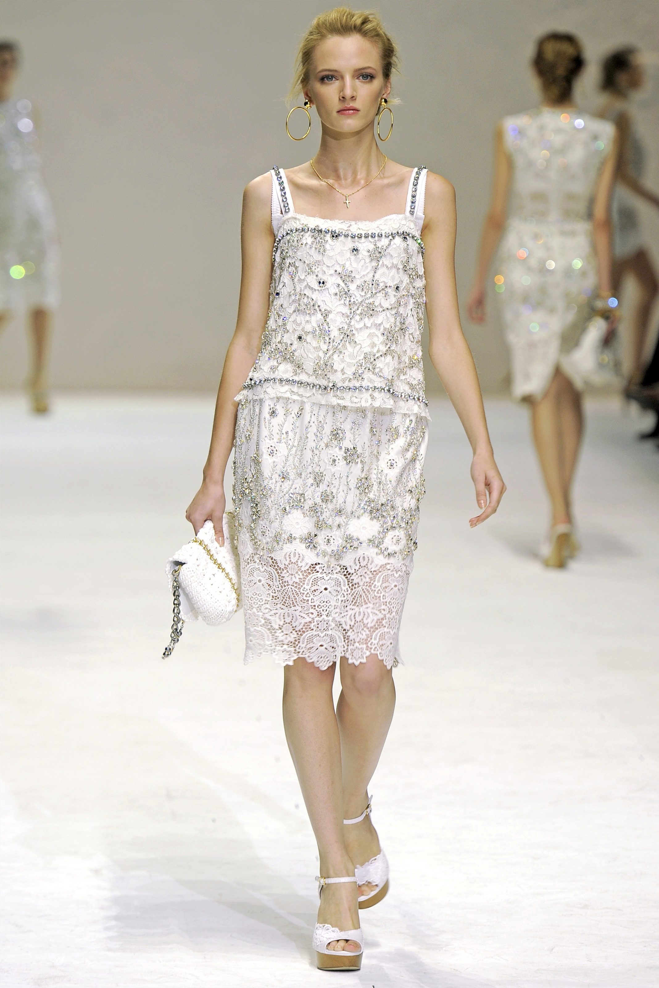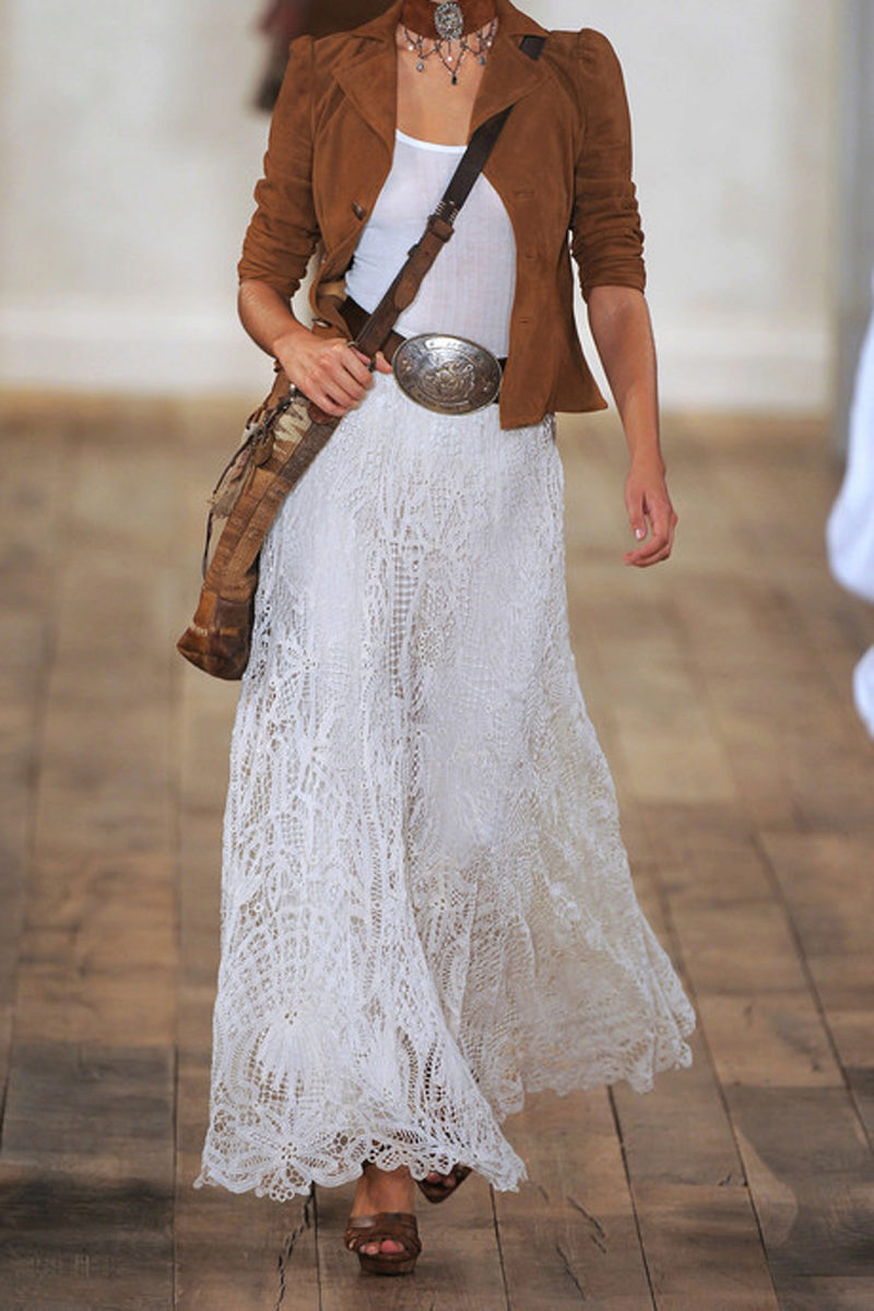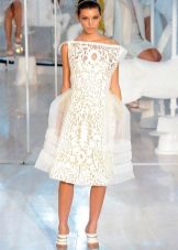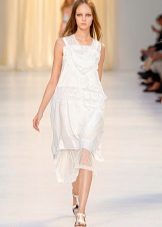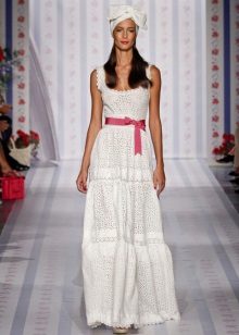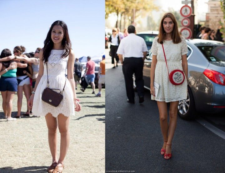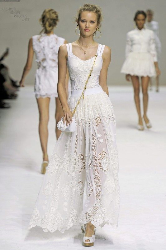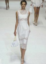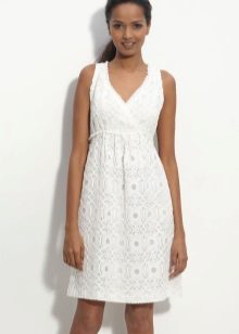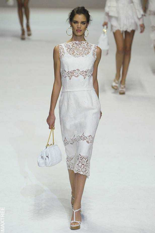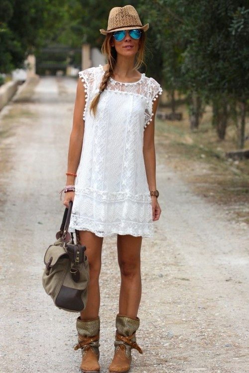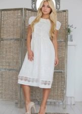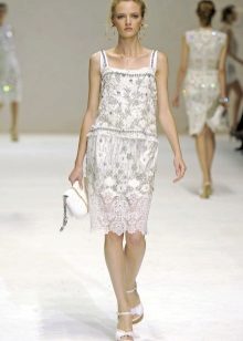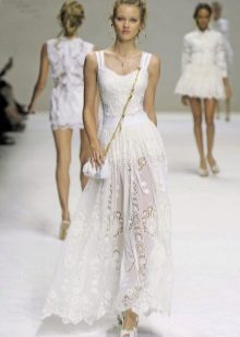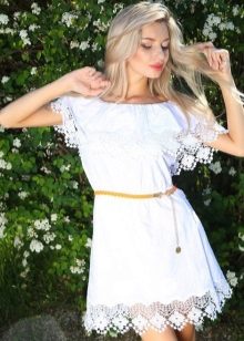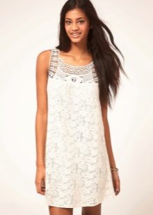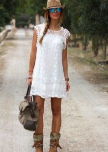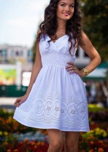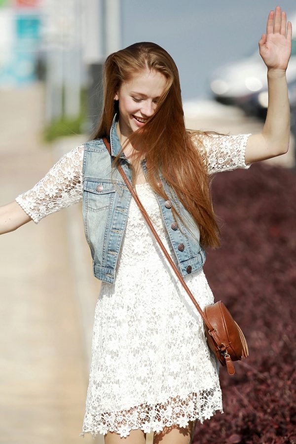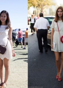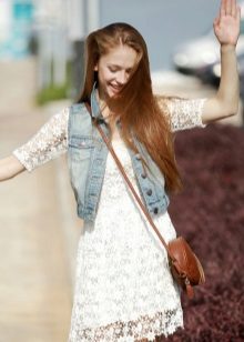 A white dress with a lace can be combined with a short denim jacket or a brightly colored bolero. The waist can be emphasized with a thin strap. Lingerie under the lace sundress is better to choose a smooth, the lace will look vulgar. As for the bag, then with such clothes a big one will look inappropriate, it is better to choose a miniature, leather or textile with a print.