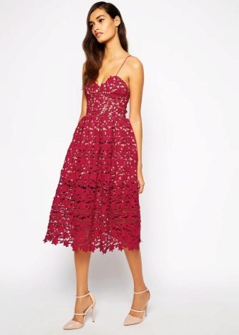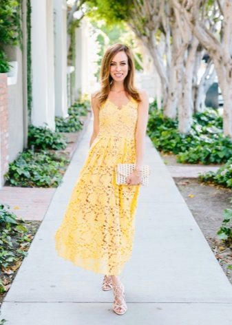 Dress with lace itself looks elegant, so you can combine it with elegant shoes or stiletto sandals and expensive jewelry (gold products, bracelets with inlays of natural stones, long earrings). A lace sundress will also harmoniously look with beads in several threads, a silk scarf around the neck or a chiffon stole. As for the hat, you can wear a stylish hat. In cool weather, such a thing on top you can throw an openwork jacket.