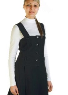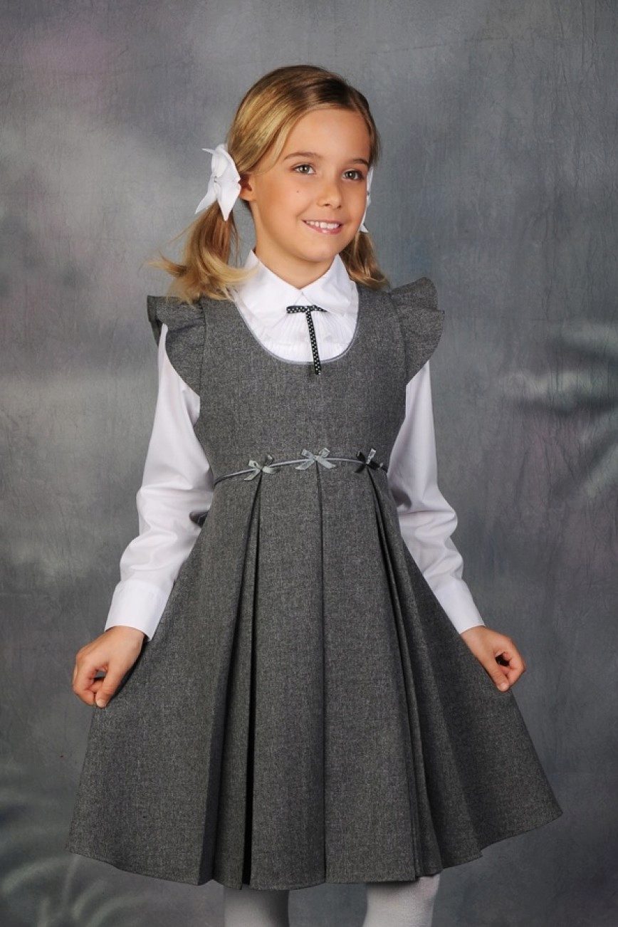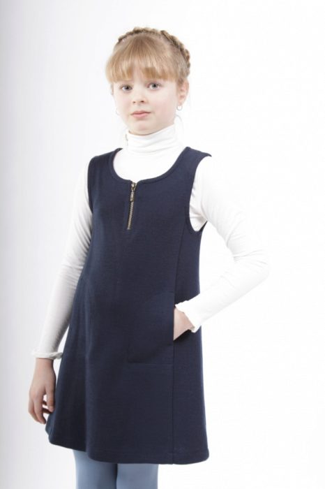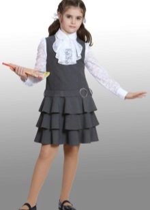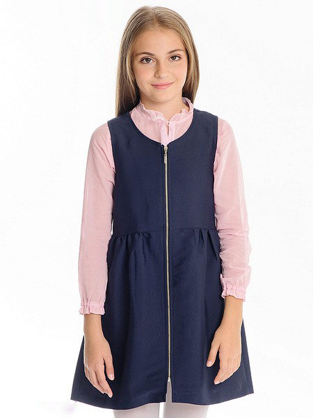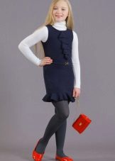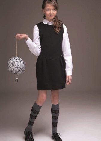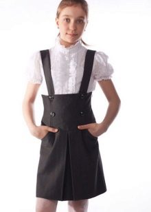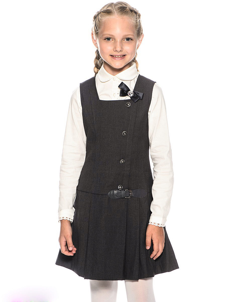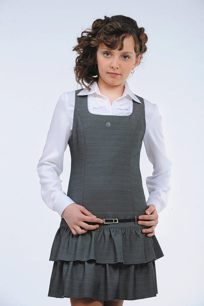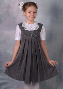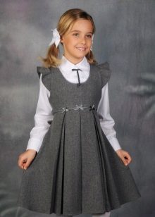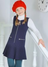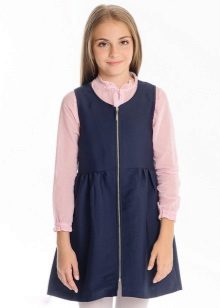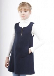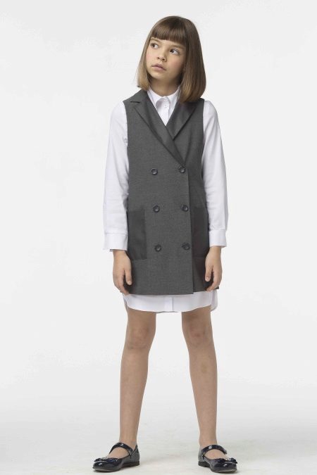 The model of a sundress-dress for a schoolgirl in the form of an elongated sleeveless jacket, a double-breasted style of a beautiful gray shade, looks originally. Costume collar and patch pockets are trimmed with fabric of the same color, but of a different texture, which emphasizes the originality and originality of the image. The length of the sundress above the knees allows you to wear under it a short blouse and a long one, as in the photo. Shoes fit any comfortable. Such a model will appeal to both the elementary schoolgirl and the teenager.