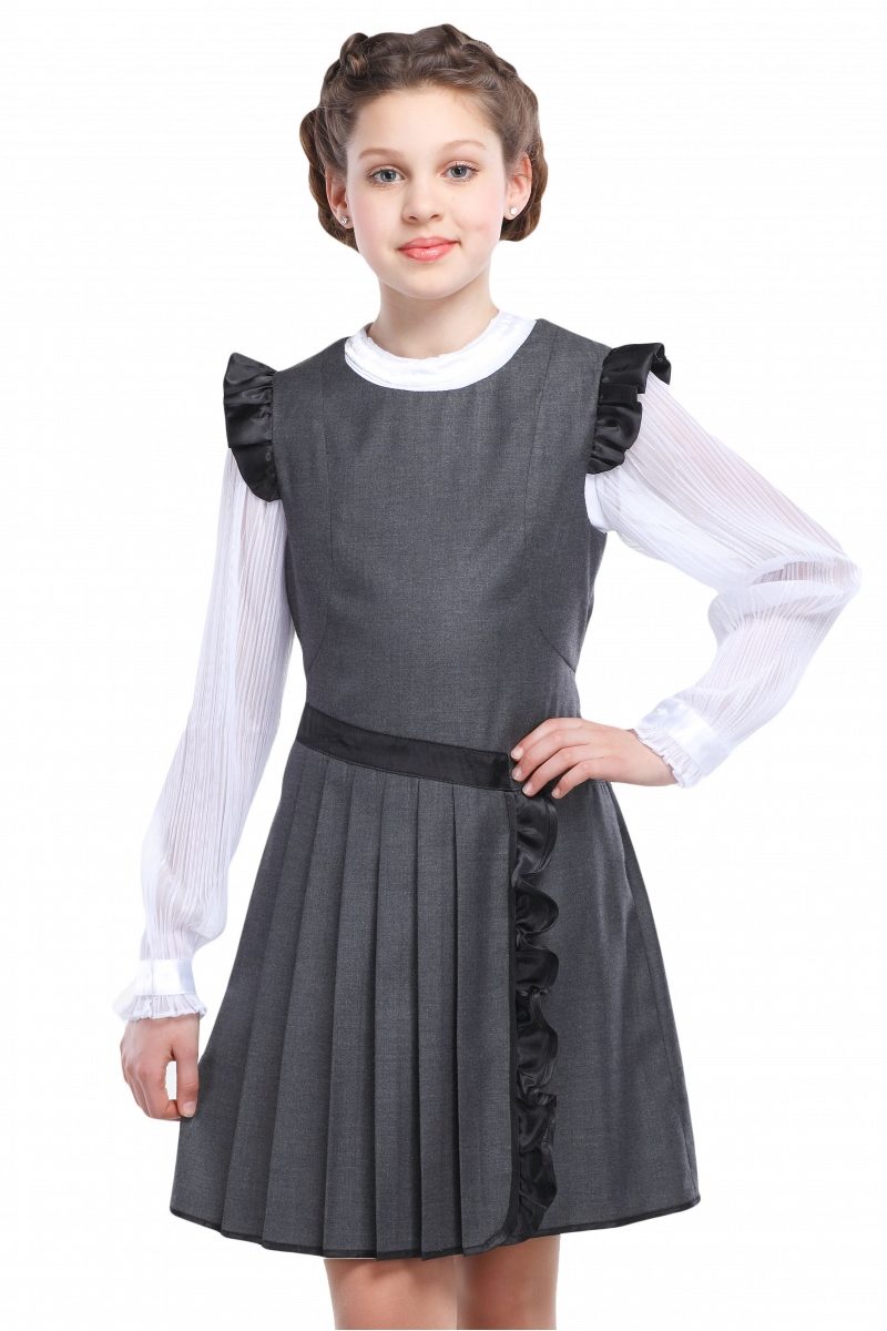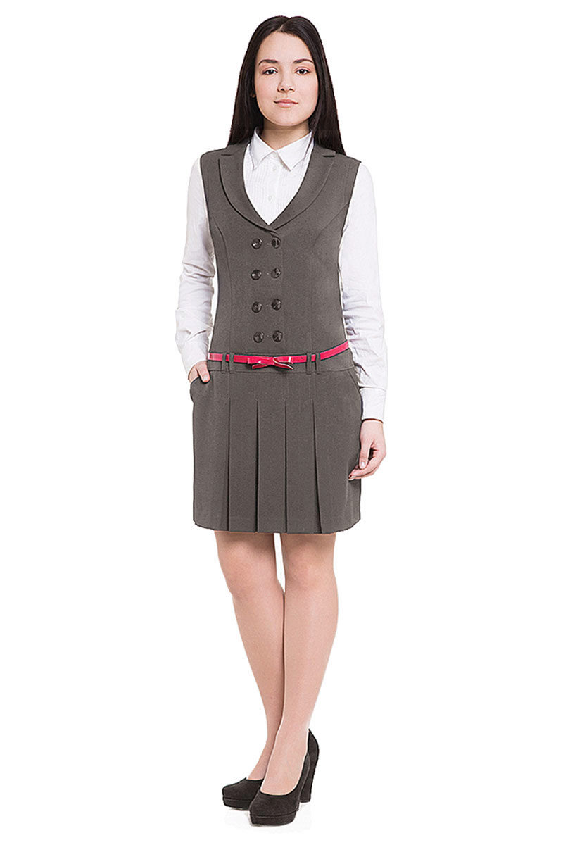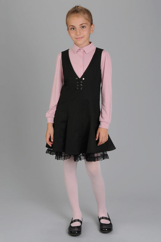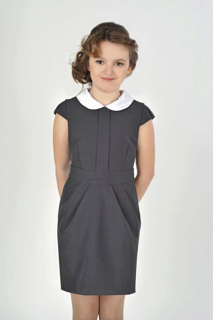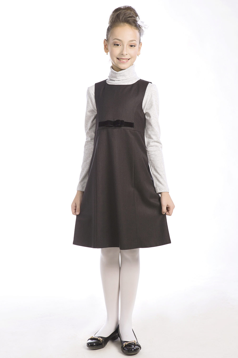 The model of a sundress-dress for a schoolgirl in the form of an elongated sleeveless jacket, a double-breasted style of a beautiful gray shade, looks originally. Costume collar and patch pockets are trimmed with fabric of the same color, but of a different texture, which emphasizes the originality and originality of the image. The length of the sundress above the knees allows you to wear under it a short blouse and a long one, as in the photo. Shoes fit any comfortable. Such a model will appeal to both the elementary schoolgirl and the teenager.