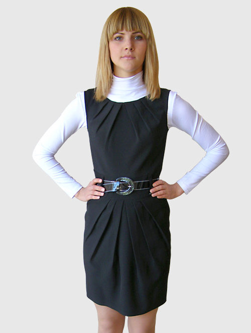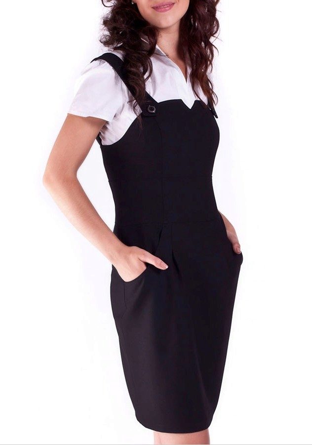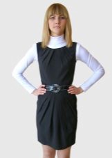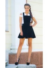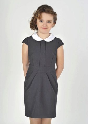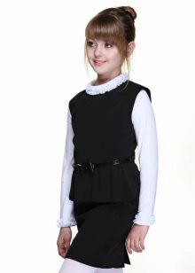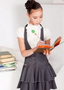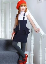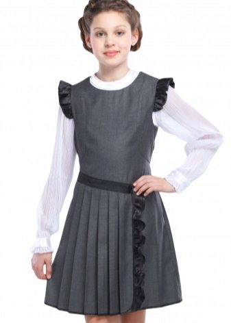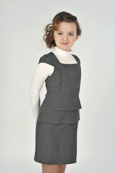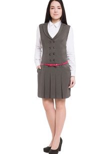 Another original look at a sundress-uniform consists in the combination of a corset version with a basque. The gray color of the fabric accentuates attention to numerous details: a two-tier Basque of practical dense fabric, a zipper at the back with a zipper gives the product restraint, knee-length, straight cut and sleeves - the lanterns look very attractive. It is easily combined with any blouses, turtlenecks, jerseys, longslivs.