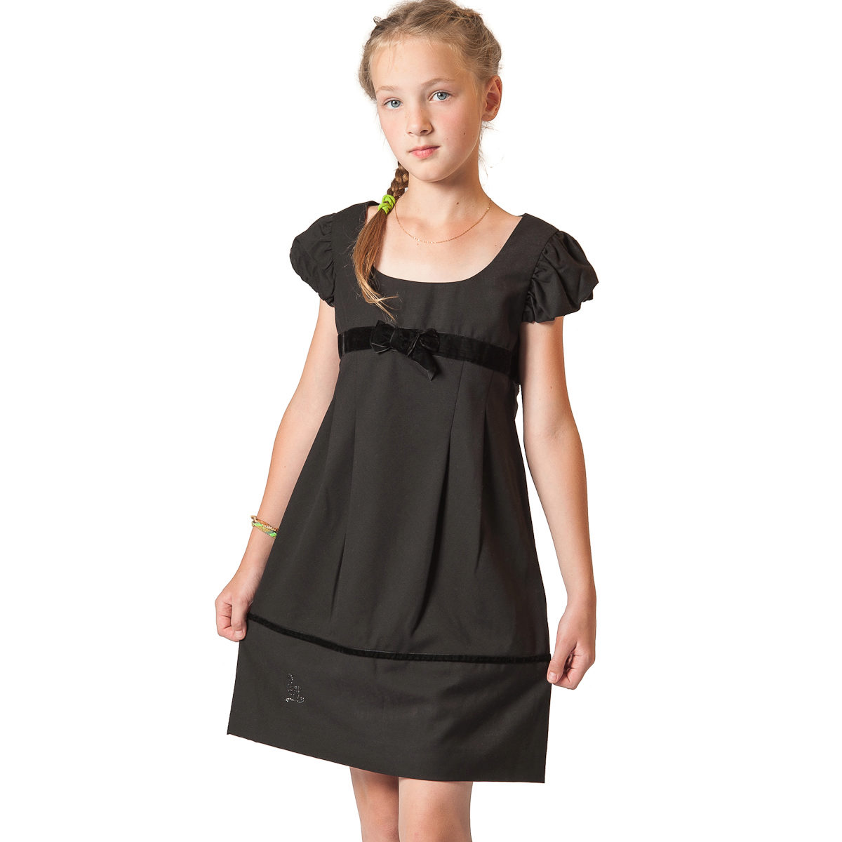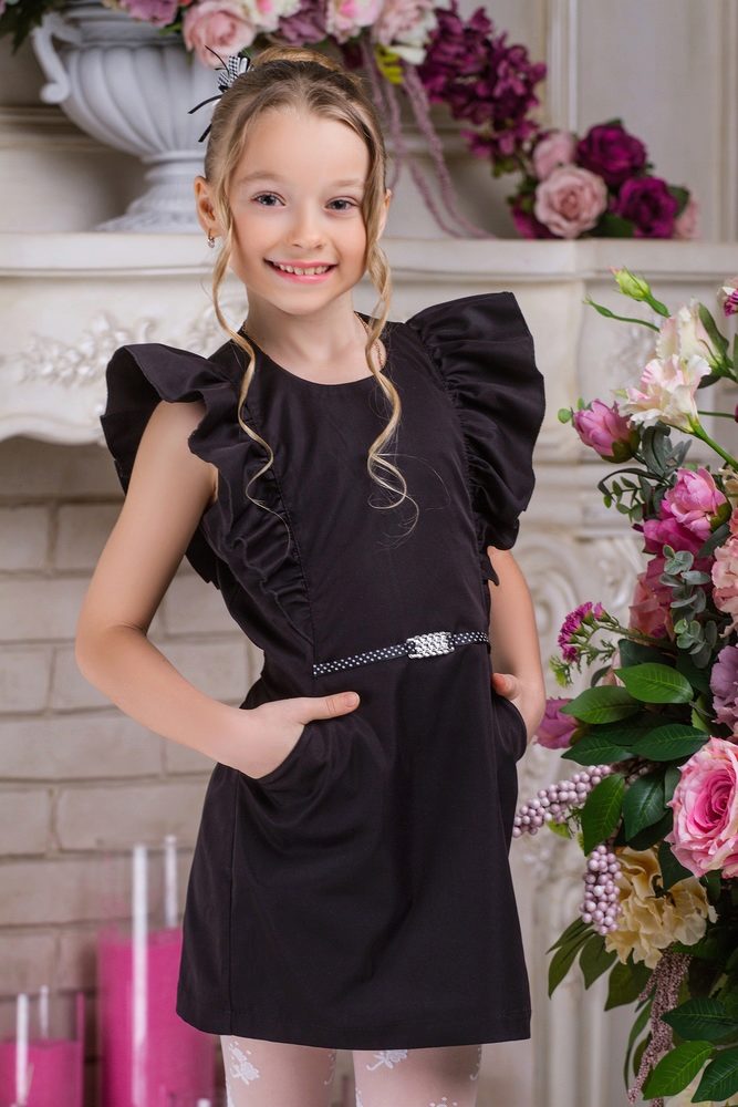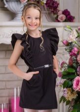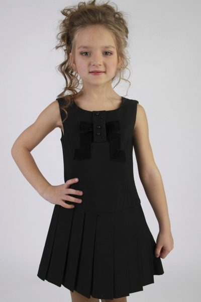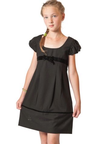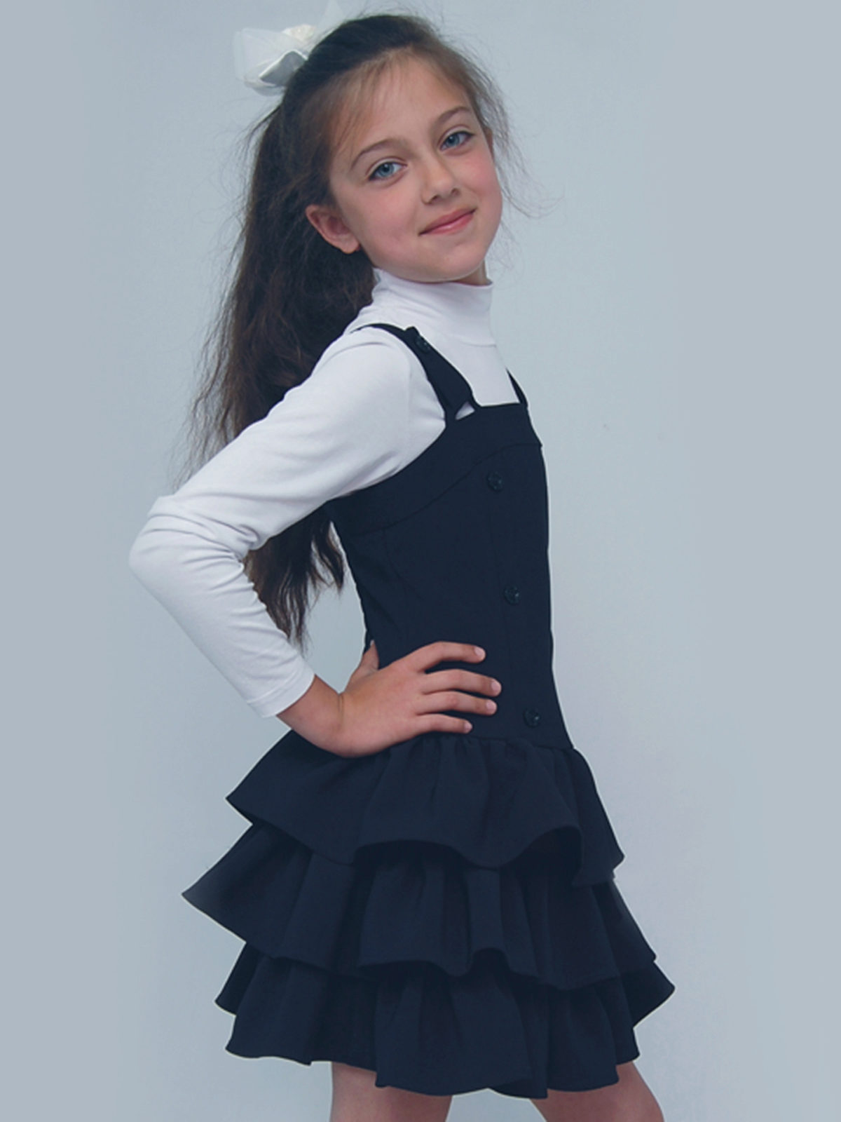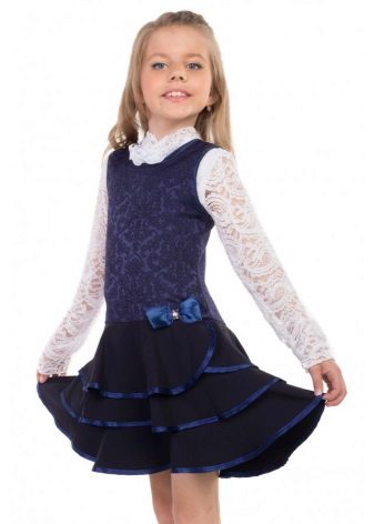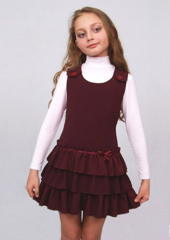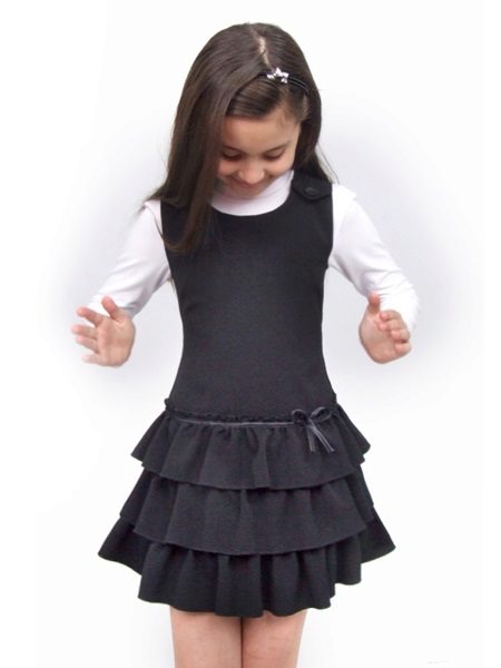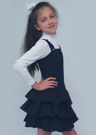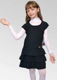 A simple and very romantic “girlish” sundress of dark color made of practical fabric will appeal to more than one “little princess”. Such a sundress with a round neck and flared skirt looks very impressive. Romance and tenderness adds a multi-layered skirt, created with a small, triple shuttlecock. A small bow separates the line of the hips, which gives the product a slightly strict, but at the same time playful look. You can wear such a dress with different elegant blouses, as well as with strict shirts and practical turtlenecks.