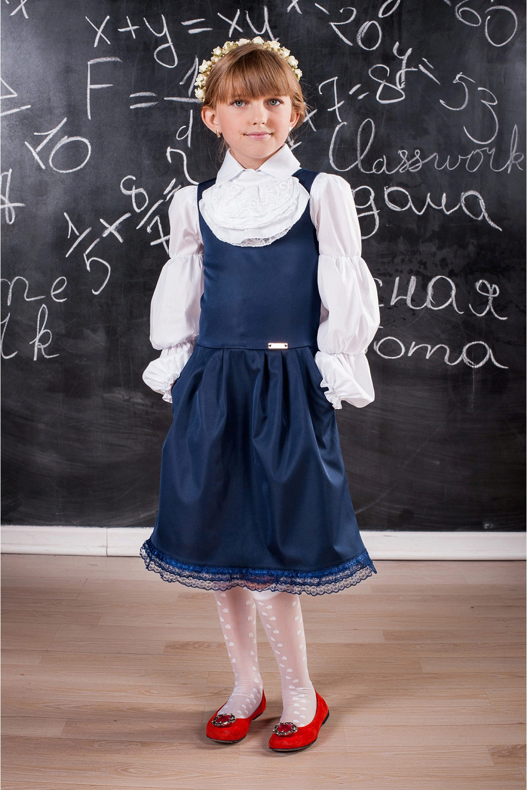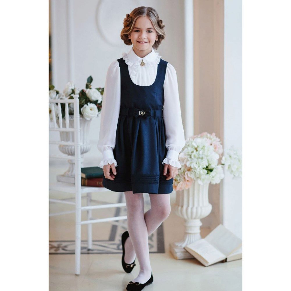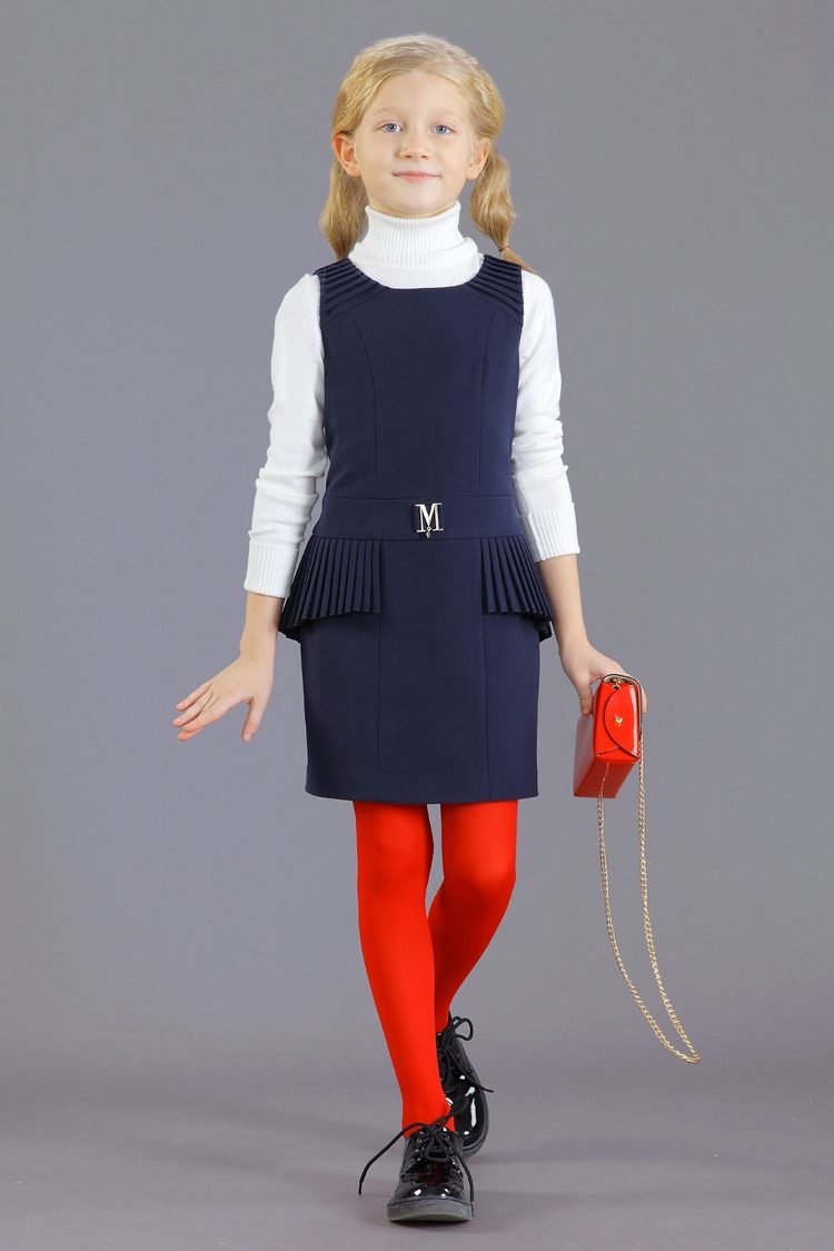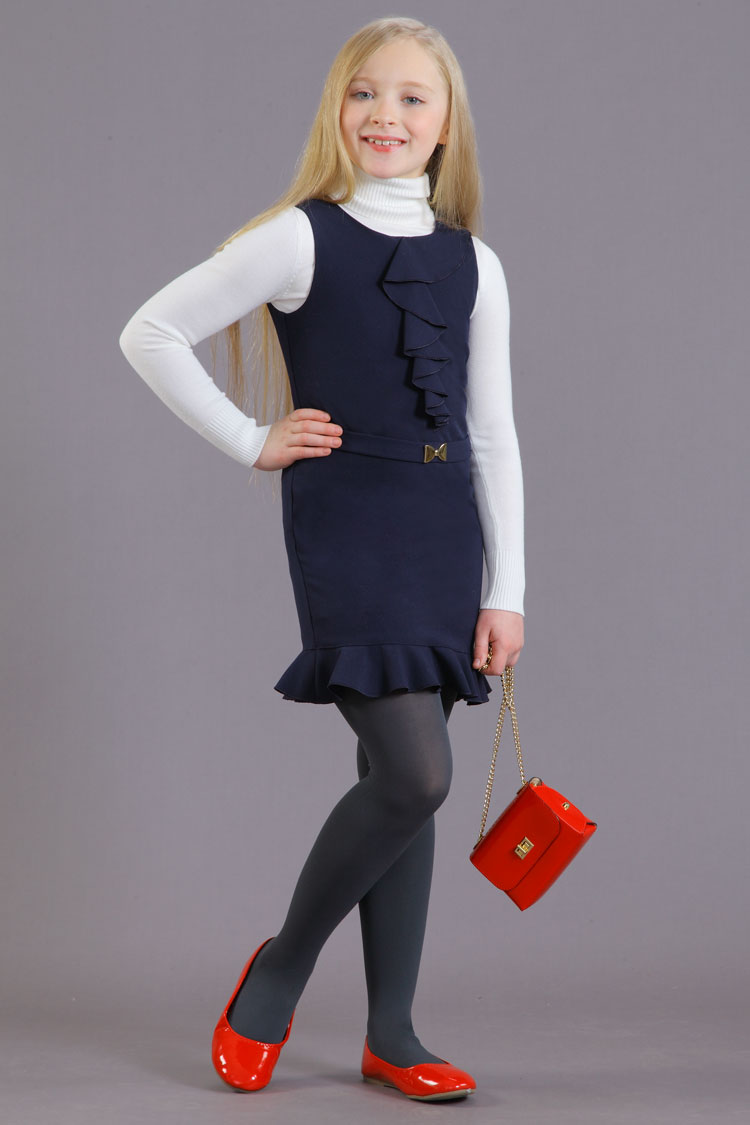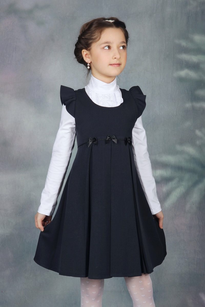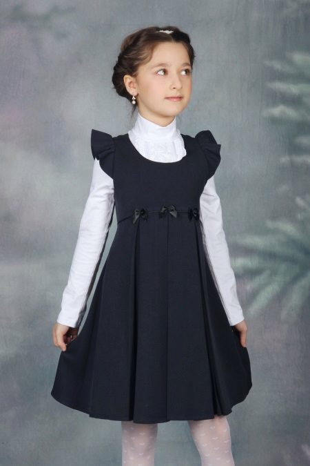 Unusual model of a sundress for schoolgirl from costume fabric of dark blue color with a high waist and decorative bows-butterflies, decorating the lines of folds on the skirt. Adds “raisins” to the usual silhouette of a trapezoid cut and the molded part of the skirt in the middle of the high waist line in the form of a hidden fold.This detail incredibly decorates a seemingly simple sundress and adds freedom to the movements of the child. Sleeves in the form of small wings look childishly funny. Turtlenecks and blouses with a collar are perfectly combined with this model.