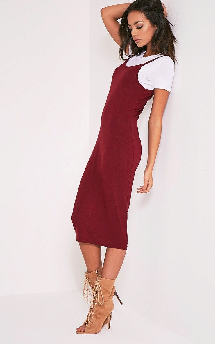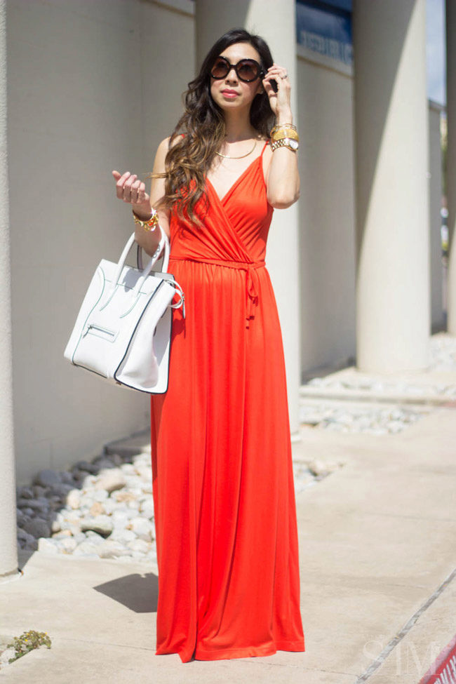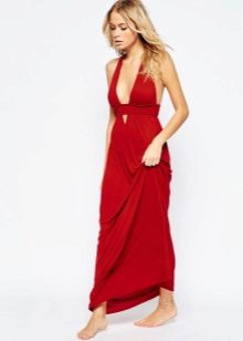- A long red wrap dress can be the basis of a casual or evening look. During the day, wear it with flat sandals, complementing the image with sunglasses and a white volume bag. In the evening, put on sandals on the platform and replace the bag with a small clutch.