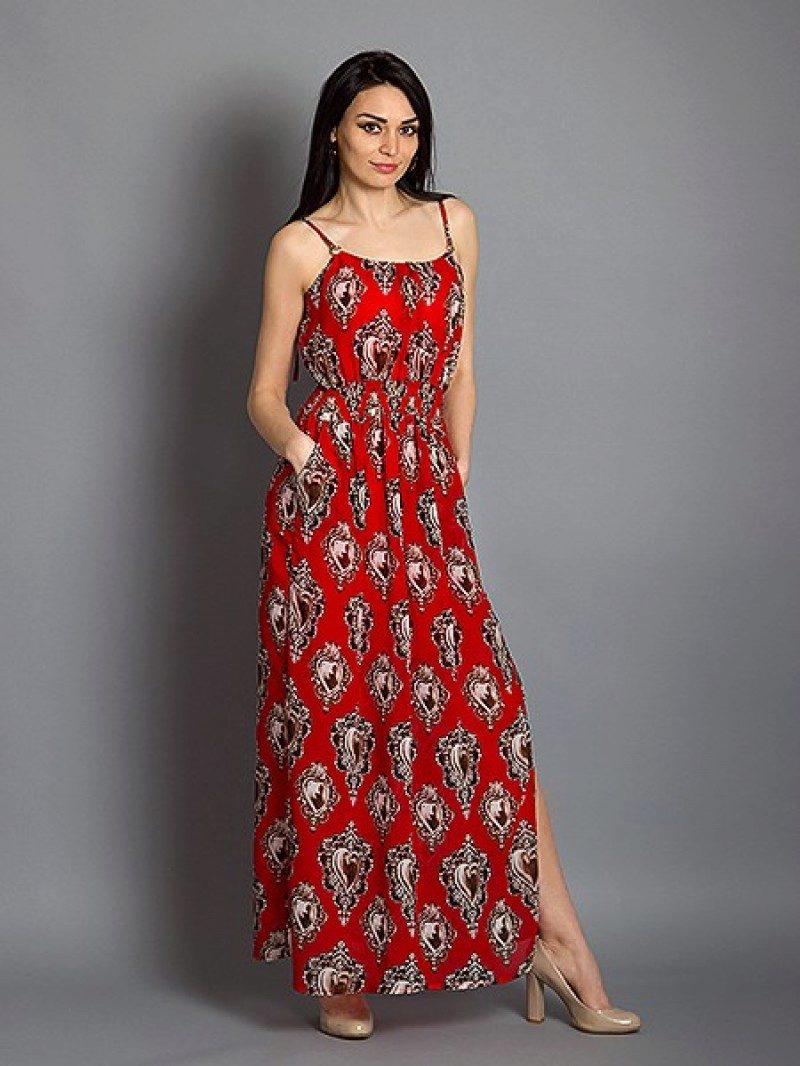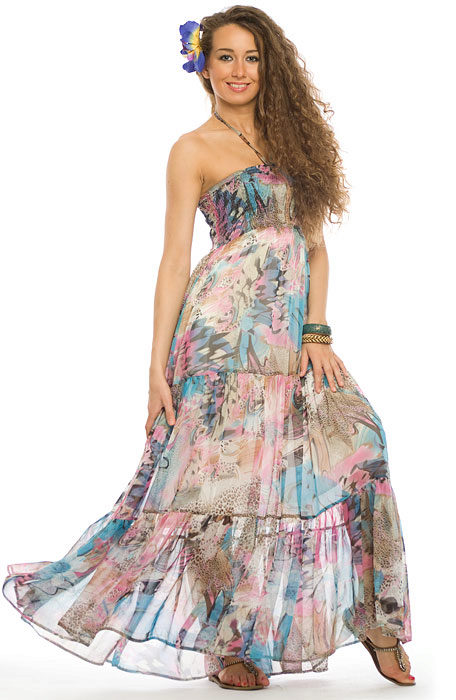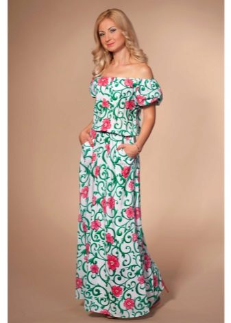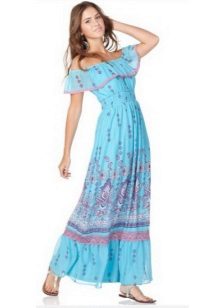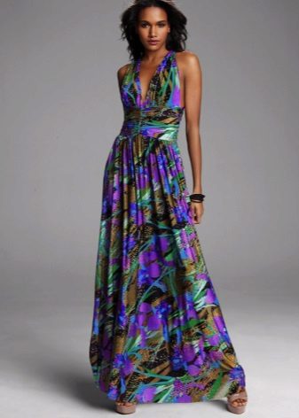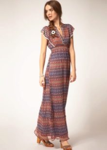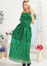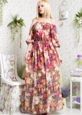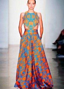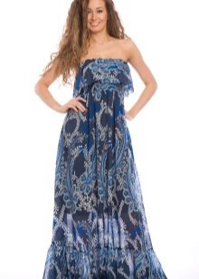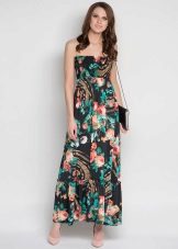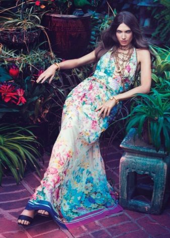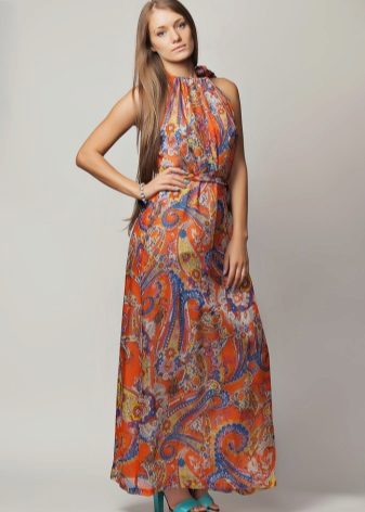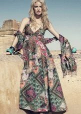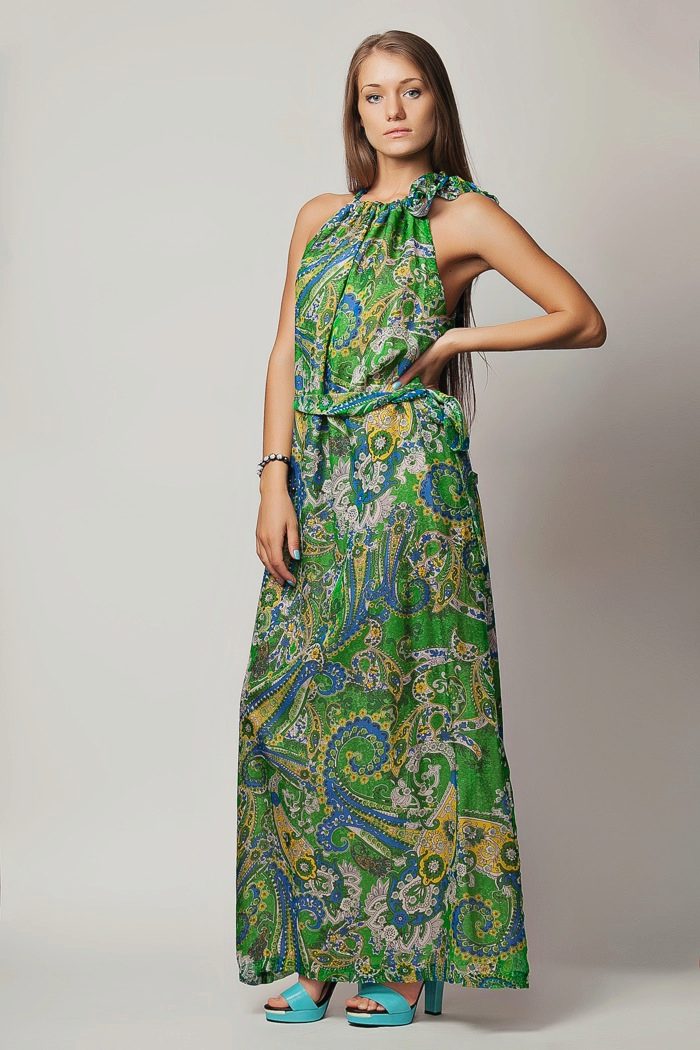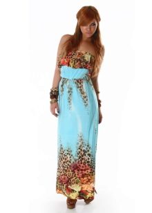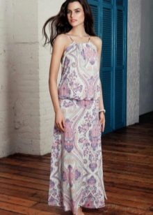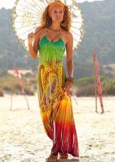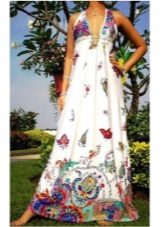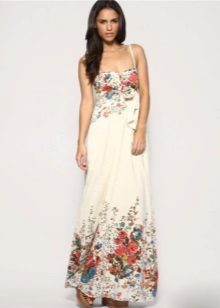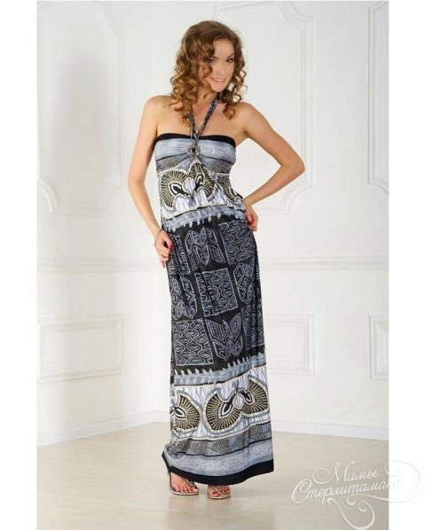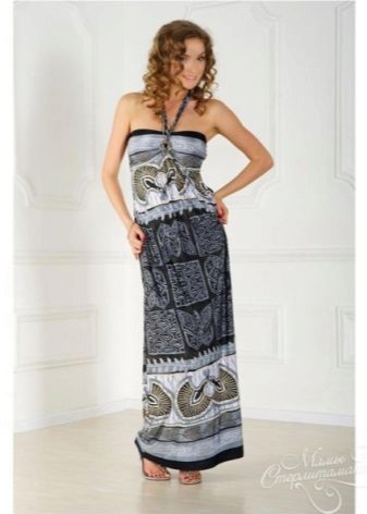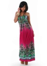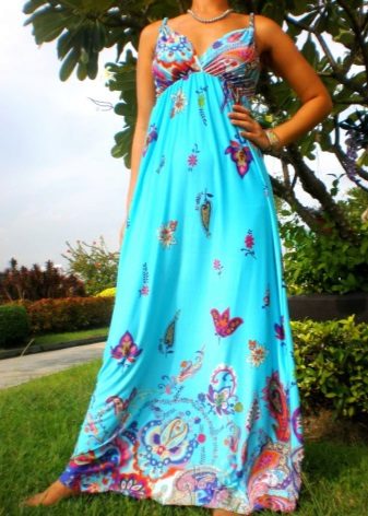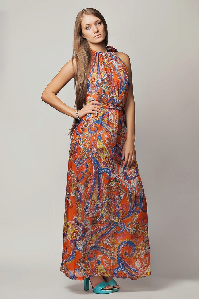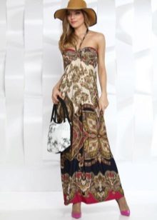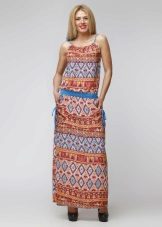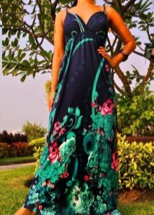 - A long fitted sundress with a flared skirt and top in the form of a bodice will be an excellent summer option. And the colorful ornament will give the product a mysterious look in the oriental style.