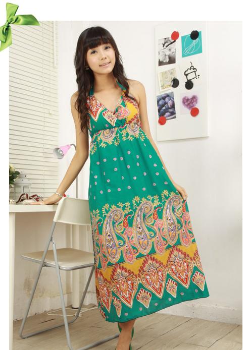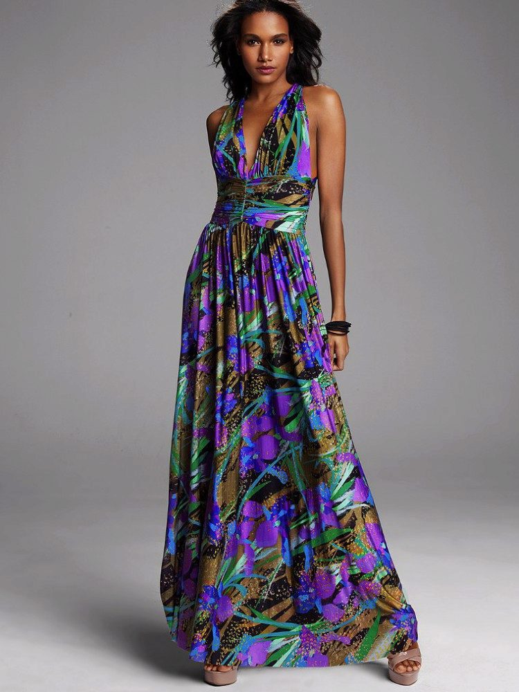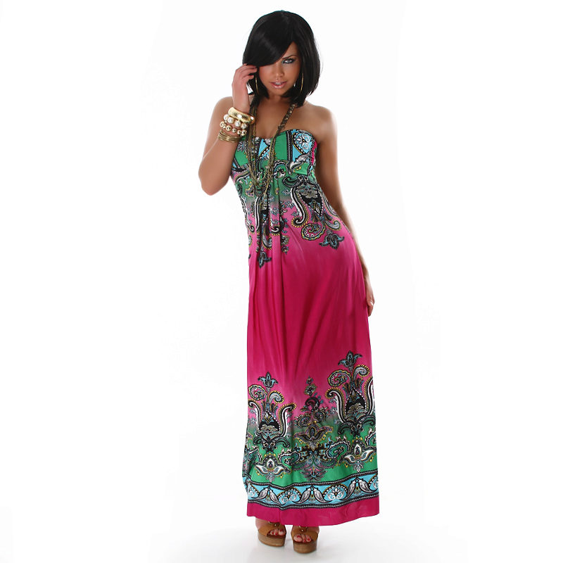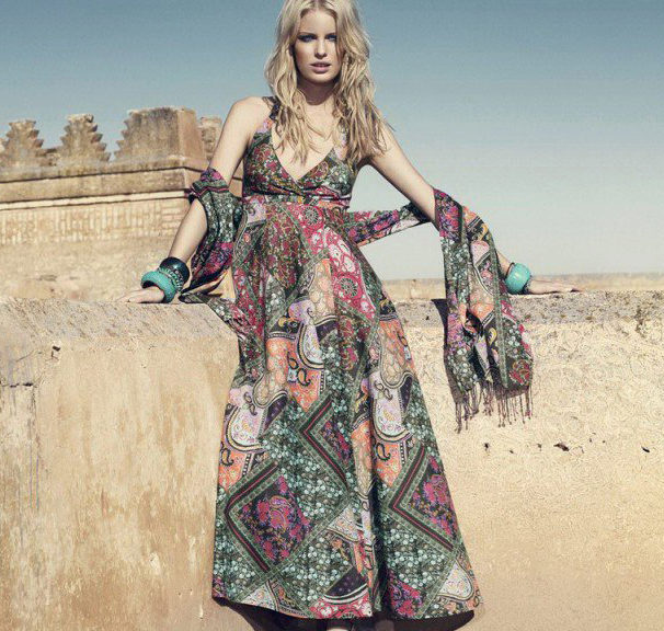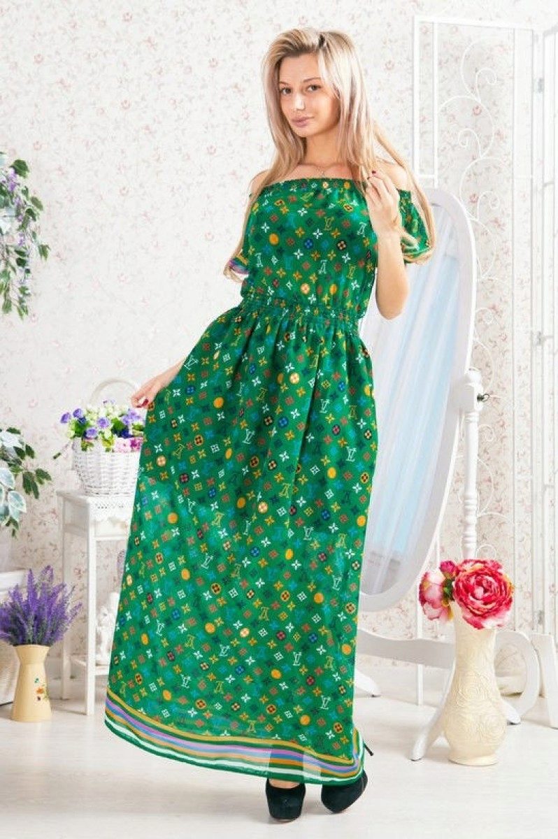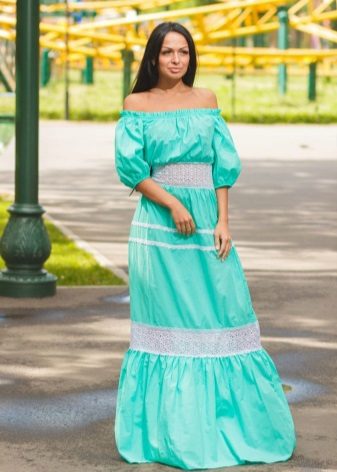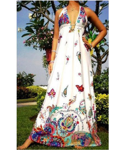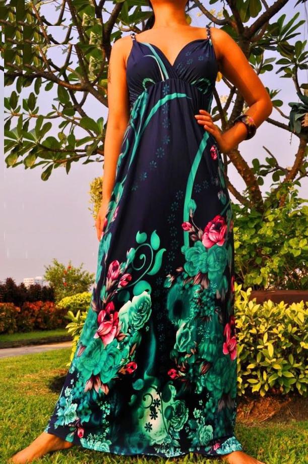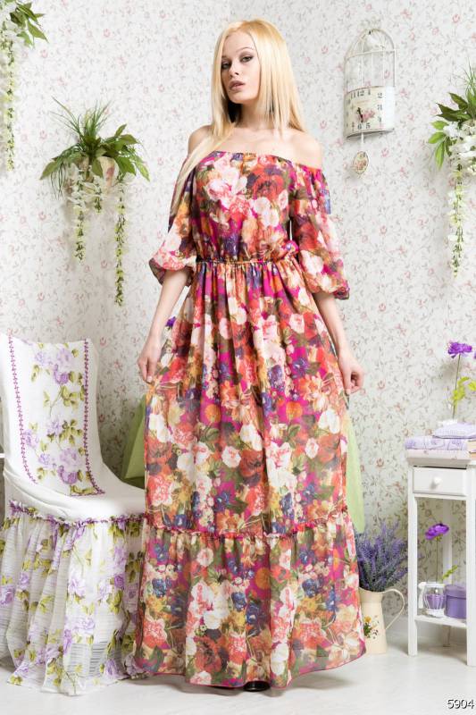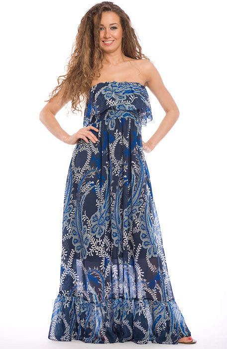 - A long fitted sundress with a flared skirt and top in the form of a bodice will be an excellent summer option. And the colorful ornament will give the product a mysterious look in the oriental style.