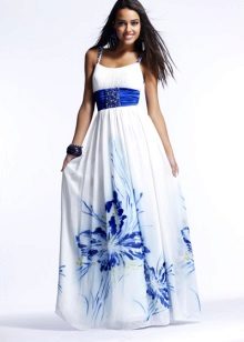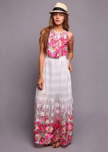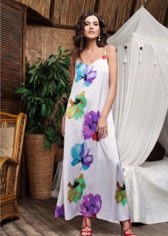 - Another interesting image is obtained when choosing a trapezoid cut sundress from light, silk fabric of white color. A bright floral print on the bottom of the product gives the image a stylish zest, and in combination with shoes with heels, the image will acquire light notes of coquetry.