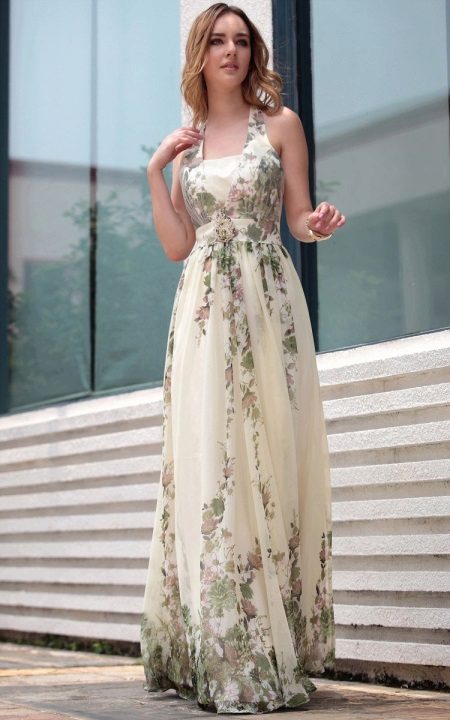 - You can create a beautiful gentle image by picking up a light chiffon sundress of a milky color, with an unobtrusive floral print, which is located at the bottom of the product, as well as at the top. The dress has a fitted style, the belt of which is decorated with an elegant brooch, so the image does not need additional accessories. In addition, you can choose only light ballet flats or shoes with not very high heels.