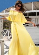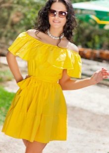Slowly but confidently, sarafans in doll style are gaining in popularity, a characteristic feature of which is a fluffy skirt, expressive shades of yellow, a bodice band, and open shoulders.